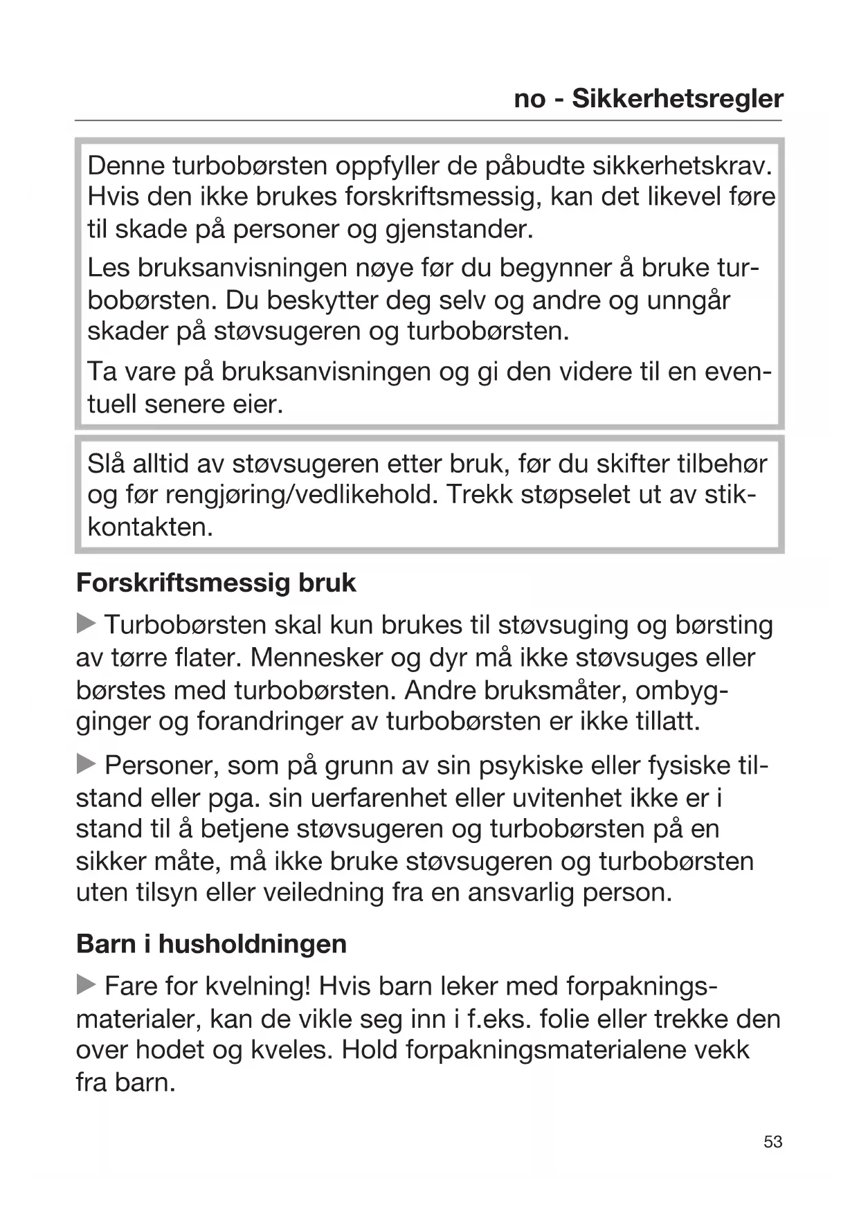 Denne turbobørsten oppfyller de påbudte sikkerhetskrav. Hvis den ikke brukes forskriftsmessig, kan det likevel føre til skade på personer og gjenstander. Les bruksanvisningen nøye før du begynner å bruke tur- bobørsten. Du beskytter deg selv og andre og unngår skader på støvsugeren og turbobørsten. Ta vare på bruksanvisningen og gi den videre til en even- tuell senere eier. Slå alltid av støvsugeren etter bruk, før du skifter tilbehør og før rengjøring/vedlikehold. Trekk støpselet ut av stik- kontakten. Forskriftsmessig bruk Turbobørsten skal kun brukes til støvsuging og børsting av tørre flater. Mennesker og dyr må ikke støvsuges eller børstes med turbobørsten. Andre bruksmåter, ombyg- ginger og forandringer av turbobørsten er ikke tillatt. Personer, som på grunn av sin psykiske eller fysiske til- stand eller pga. sin uerfarenhet eller uvitenhet ikke er i stand til å betjene støvsugeren og turbobørsten på en sikker måte, må ikke bruke støvsugeren og turbobørsten uten tilsyn eller veiledning fra en ansvarlig person. Barn i husholdningen Fare for kvelning! Hvis barn leker med forpaknings- materialer, kan de vikle seg inn i f.eks. folie eller trekke den over hodet og kveles. Hold forpakningsmaterialene vekk fra barn.no - Sikkerhetsregler