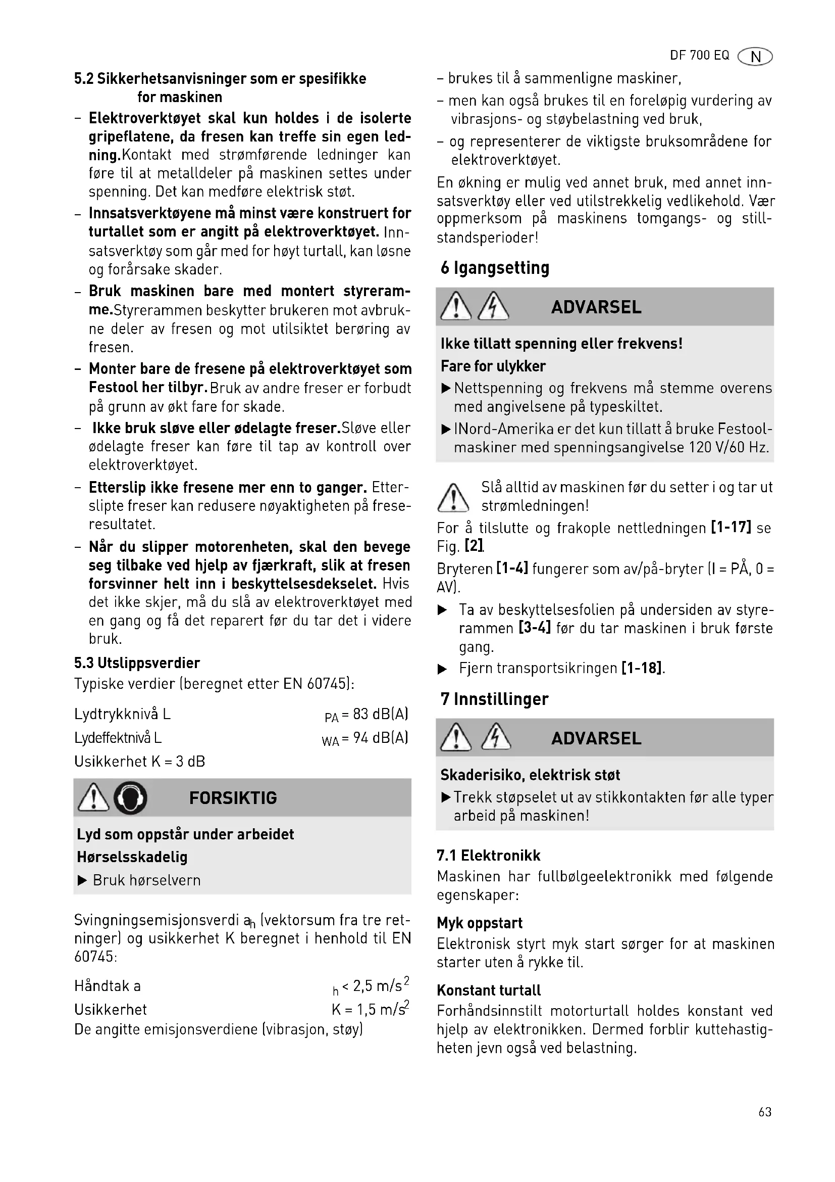 INord-Amerika er det kun tillatt å bruke Festool- maskiner med spenningsangivelse 120 V/60 Hz. ADVARSEL Skaderisiko, elektrisk støt
