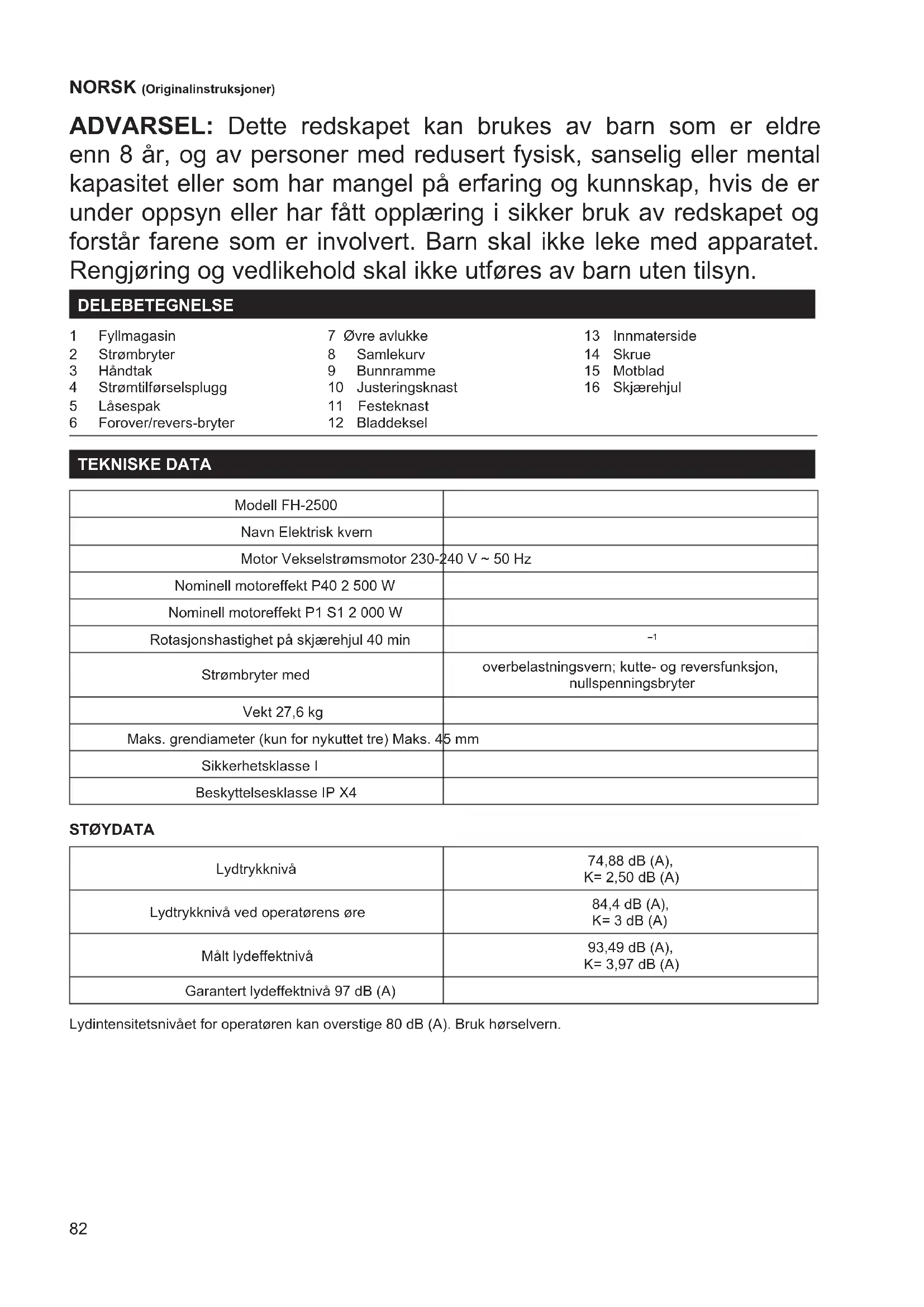 Gäller endast Europa EG-försäkran om överensstämmelse nns bifogad i Bilaga A till denna bruksanvisning.82 NORSK (Originalinstruksjoner) ADVARSEL: Dette redskapet kan brukes av barn som er eldre enn 8 år, og av personer med redusert fysisk, sanselig eller mental kapasitet eller som har mangel på erfaring og kunnskap, hvis de er under oppsyn eller har fått opplæring i sikker bruk av redskapet og forstår farene som er involvert. Barn skal ikke leke med apparatet. Rengjøring og vedlikehold skal ikke utføres av barn uten tilsyn. DELEBETEGNELSE 1 Fyllmagasin 2 Strømbryter 3 Håndtak 4 Strømtilførselsplugg 5 Låsespak 6 Forover/revers-bryter 7 Øvre avlukke 8 Samlekurv 9 Bunnramme 10 Justeringsknast 11 Festeknast 12 Bladdeksel 13 Innmaterside 14 Skrue 15 Motblad 16 Skjærehjul TEKNISKE DATA Modell FH-2500 Navn Elektrisk kvern Motor Vekselstrømsmotor 230-240 V ~ 50 Hz Nominell motoreffekt P40 2 500 W Nominell motoreffekt P1 S1 2 000 W Rotasjonshastighet på skjærehjul 40 min
