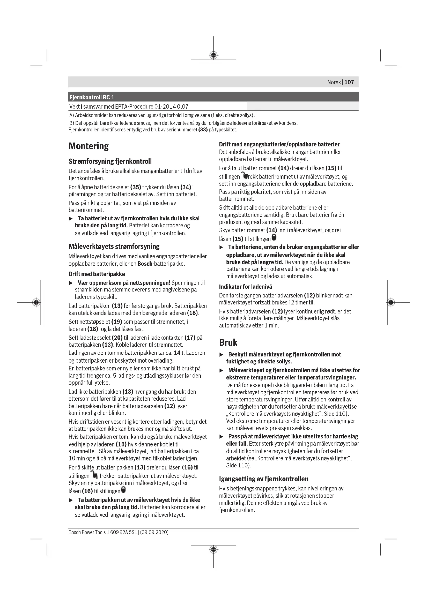 Batteri 1×1,5V LR6(AA) 1 609 92A 5S1 | (09.09.2020) Bosch Power ToolsNorsk | 107 Fjernkontroll RC 1 Vekt i samsvar med EPTA-Procedure 01:2014 0,07 A) Arbeidsområdet kan reduseres ved ugunstige forhold i omgivelsene (f.eks. direkte sollys). B) Det oppstår bare ikke-ledende smuss, men det forventes nå og da forbigående ledeevne forårsaket av kondens. Fjernkontrollen identifiseres entydig ved bruk av serienummeret(33) på typeskiltet. Montering Strømforsyning fjernkontroll Det anbefales å bruke alkaliske manganbatterier til drift av fjernkontrollen. For å åpne batteridekselet(35) trykker du låsen(34) i pilretningen og tar batteridekselet av. Sett inn batteriet. Pass på riktig polaritet, som vist på innsiden av batterirommet. u Ta batteriet ut av fjernkontrollen hvis du ikke skal bruke den på lang tid. Batteriet kan korrodere og selvutlade ved langvarig lagring i fjernkontrollen. Måleverktøyets strømforsyning Måleverktøyet kan drives med vanlige engangsbatterier eller oppladbare batterier, eller enBosch-batteripakke. Drift med batteripakke u Vær oppmerksom på nettspenningen! Spenningen til strømkilden må stemme overens med angivelsene på laderens typeskilt. Lad batteripakken(13) før første gangs bruk. Batteripakken kan utelukkende lades med den beregnede laderen(18). Sett nettstøpselet(19) som passer til strømnettet, i laderen(18), og la det låses fast. Sett ladestøpselet(20) til laderen i ladekontakten(17) på batteripakken(13). Koble laderen til strømnettet. Ladingen av den tomme batteripakken tar ca.14t. Laderen og batteripakken er beskyttet mot overlading. En batteripakke som er ny eller som ikke har blitt brukt på lang tid trenger ca. 5 ladings- og utladingssykluser før den oppnår full ytelse. Lad ikke batteripakken(13) hver gang du har brukt den, ettersom det fører til at kapasiteten reduseres. Lad batteripakken bare når batteriadvarselen(12) lyser kontinuerlig eller blinker. Hvis driftstiden er vesentlig kortere etter ladingen, betyr det at batteripakken ikke kan brukes mer og må skiftes ut. Hvis batteripakken er tom, kan du også bruke måleverktøyet ved hjelp av laderen(18) hvis denne er koblet til strømnettet. Slå av måleverktøyet, lad batteripakken i ca. 10min og slå på måleverktøyet med tilkoblet lader igjen. For å skifte ut batteripakken(13) dreier du låsen(16) til stillingen og trekker batteripakken ut av måleverktøyet. Skyv en ny batteripakke inn i måleverktøyet, og drei låsen(16) til stillingen . u Ta batteripakken ut av måleverktøyet hvis du ikke skal bruke den på lang tid. Batterier kan korrodere eller selvutlade ved langvarig lagring i måleverktøyet. Drift med engangsbatterier/oppladbare batterier Det anbefales å bruke alkaliske manganbatterier eller oppladbare batterier til måleverktøyet. For å ta ut batterirommet(14) dreier du låsen(15) til stillingen . Trekk batterirommet ut av måleverktøyet, og sett inn engangsbatteriene eller de oppladbare batteriene. Pass på riktig polaritet, som vist på innsiden av batterirommet. Skift alltid ut alle de oppladbare batteriene eller engangsbatteriene samtidig. Bruk bare batterier fra én produsent og med samme kapasitet. Skyv batterirommet(14) inn i måleverktøyet, og drei låsen(15) til stillingen . u Ta batteriene, enten du bruker engangsbatterier eller oppladbare, ut av måleverktøyet når du ikke skal bruke det på lengre tid. De vanlige og de oppladbare batteriene kan korrodere ved lengre tids lagring i måleverktøyet og lades ut automatisk. Indikator for ladenivå Den første gangen batteriadvarselen(12) blinker rødt kan måleverktøyet fortsatt brukes i 2timer til. Hvis batteriadvarselen(12) lyser kontinuerlig rødt, er det ikke mulig å foreta flere målinger. Måleverktøyet slås automatisk av etter 1min. Bruk u Beskytt måleverktøyet og fjernkontrollen mot fuktighet og direkte sollys. u Måleverktøyet og fjernkontrollen må ikke utsettes for ekstreme temperaturer eller temperatursvingninger. De må for eksempel ikke bli liggende i bilen i lang tid. La måleverktøyet og fjernkontrollen tempereres før bruk ved store temperatursvingninger. Utfør alltid en kontroll av nøyaktigheten før du fortsetter å bruke måleverktøyet(se „Kontrollere måleverktøyets nøyaktighet“, Side110). Ved ekstreme temperaturer eller temperatursvingninger kan målevertøyets presisjon svekkes. u Pass på at måleverktøyet ikke utsettes for harde slag eller fall. Etter sterk ytre påvirkning på måleverktøyet bør du alltid kontrollere nøyaktigheten før du fortsetter arbeidet (se „Kontrollere måleverktøyets nøyaktighet“, Side110). Igangsetting av fjernkontrollen Hvis betjeningsknappene trykkes, kan nivelleringen av måleverktøyet påvirkes, slik at rotasjonen stopper midlertidig. Denne effekten unngås ved bruk av fjernkontrollen. Bosch Power Tools 1 609 92A 5S1 | (09.09.2020)108 | Norsk Fjernkontrollen er klar for drift så lenge et batteri med tilstrekkelig spenning er satt inn. Plasser måleverktøyet slik at fjernkontrollens signaler når en av følerne(7) i direkte retning. Hvis ikke fjernkontrollen kan rettes direkte mot en føler, reduseres rekkevidden. Ved refleksjon av signalet (for eksempel på vegger) kan rekkevidden forbedres igjen også ved indirekte signal. Etter at en knapp på fjernkontrollen har blitt trykt, viser en lysende indikator for signalsending(31) at et signal har blitt sendt ut. Det er ikke mulig å slå måleverktøyet på og av med fjernkontrollen. Igangsetting rotasjonslaser u Hold arbeidsområdet fritt for hindringer som kan reflektere eller hindre laserstrålen. Tildekk for eksempel glinsende eller blanke overflater. Ikke mål gjennom glassruter eller lignende materialer. Hvis laserstrålen reflekteres eller hindres, kan måleresultatene bli feil. Stille opp måleverktøyet Horisontal posisjon Vertikal posisjon Sett måleverktøyet på et stabilt underlag i horisontal eller vertikal posisjon, monter det på et stativ(38) elle