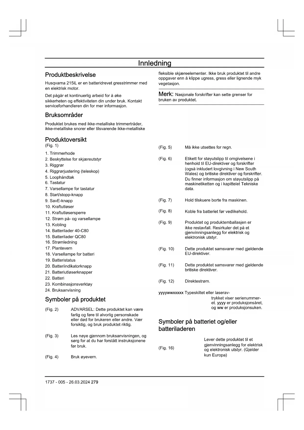Symboler på produktet (Fig. 2) ADVARSEL: Dette produktet kan være farlig og føre til alvorlig personskade eller død for brukeren eller andre. Vær forsiktig, og bruk produktet riktig. (Fig. 3) Les nøye gjennom bruksanvisningen, og sørg for at du har forstått instruksjonene før bruk. (Fig. 4) Bruk øyevern. (Fig. 5) Må ikke utsettes for regn. (Fig. 6) Etikett for støyutslipp til omgivelsene i henhold til EU-direktiver og forskrifter (også inkludert lovgivning i New South Wales) og britiske direktiver og forskrifter. Du finner informasjon om støyutslipp på maskinetiketten og i kapittelet Tekniske data. (Fig. 7) Hold tilskuere borte fra maskinen. (Fig. 8) Koble fra batteriet før vedlikehold. (Fig. 9) Produktet og produktemballasjen er ikke restavfall. Resirkuler det på et gjenvinningsanlegg for elektrisk og elektronisk utstyr. (Fig. 10) Dette produktet samsvarer med gjeldende EU-direktiver. (Fig. 11) Dette produktet samsvarer med gjeldende britiske direktiver. (Fig. 12) Direktestrøm. yyyywwxxxxx Typeskiltet eller laserav- trykket viser serienummer- et. yyyy er produksjonsåret, og ww er produksjonsuken. Symboler på batteriet og/eller batteriladeren (Fig. 16) Lever dette produktet til et gjenvinningsanlegg for elektrisk og elektronisk utstyr. (Gjelder kun Europa) 1737 - 005 - 26.03.2024 279(Fig. 13) Feilsikker transformator. (Fig. 14) Batteriladeren skal bare brukes og oppbevares innendørs. (Fig. 15) Dobbeltisolert. Skader på produktet Vi er ikke ansvarlige for skader på produktet vårt hvis: