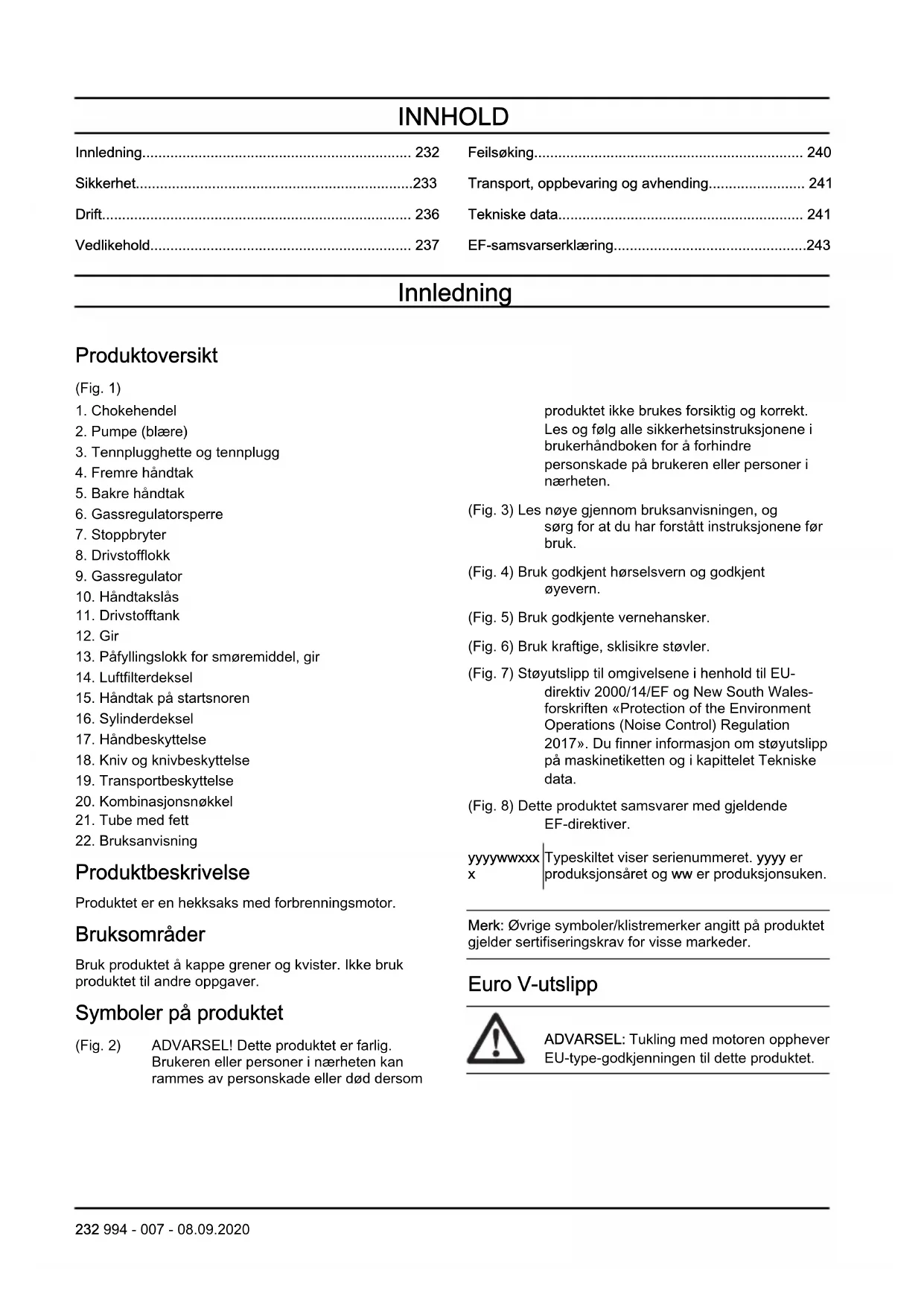 Produktbeskrivelse Produktet er en hekksaks med forbrenningsmotor. Bruksområder Bruk produktet å kappe grener og kvister. Ikke bruk produktet til andre oppgaver. Symboler på produktet (Fig. 2) ADVARSEL! Dette produktet er farlig. Brukeren eller personer i nærheten kan rammes av personskade eller død dersom produktet ikke brukes forsiktig og korrekt. Les og følg alle sikkerhetsinstruksjonene i brukerhåndboken for å forhindre personskade på brukeren eller personer i nærheten. (Fig. 3) Les nøye gjennom bruksanvisningen, og sørg for at du har forstått instruksjonene før bruk. (Fig. 4) Bruk godkjent hørselsvern og godkjent øyevern. (Fig. 5) Bruk godkjente vernehansker. (Fig. 6) Bruk kraftige, sklisikre støvler. (Fig. 7) Støyutslipp til omgivelsene i henhold til EU- direktiv 2000/14/EF og New South Wales- forskriften «Protection of the Environment Operations (Noise Control) Regulation 2017». Du finner informasjon om støyutslipp på maskinetiketten og i kapittelet Tekniske data. (Fig. 8) Dette produktet samsvarer med gjeldende EF-direktiver. yyyywwxxx