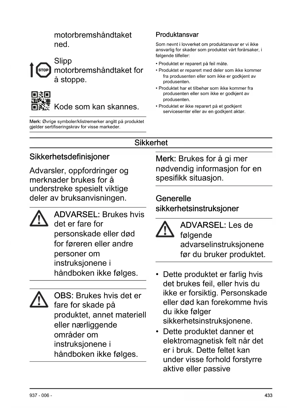 937 - 006 -• Utfør regelmessig kontroll av sikkerhetsutstyret. Ta