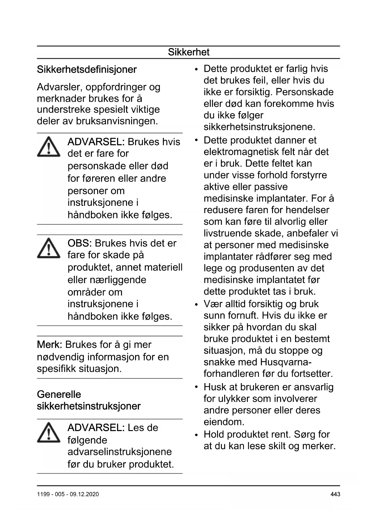 1199 - 005 - 09.12.2020Sikkerhet Sikkerhetsdefinisjoner Advarsler, oppfordringer og merknader brukes for å understreke spesielt viktige deler av bruksanvisningen. ADVARSEL: Brukes hvis det er fare for personskade eller død for føreren eller andre personer om instruksjonene i håndboken ikke følges. OBS: Brukes hvis det er fare for skade på produktet, annet materiell eller nærliggende områder om instruksjonene i håndboken ikke følges. Merk: Brukes for å gi mer nødvendig informasjon for en spesifikk situasjon. Generelle sikkerhetsinstruksjoner ADVARSEL: Les de følgende advarselinstruksjonene før du bruker produktet.