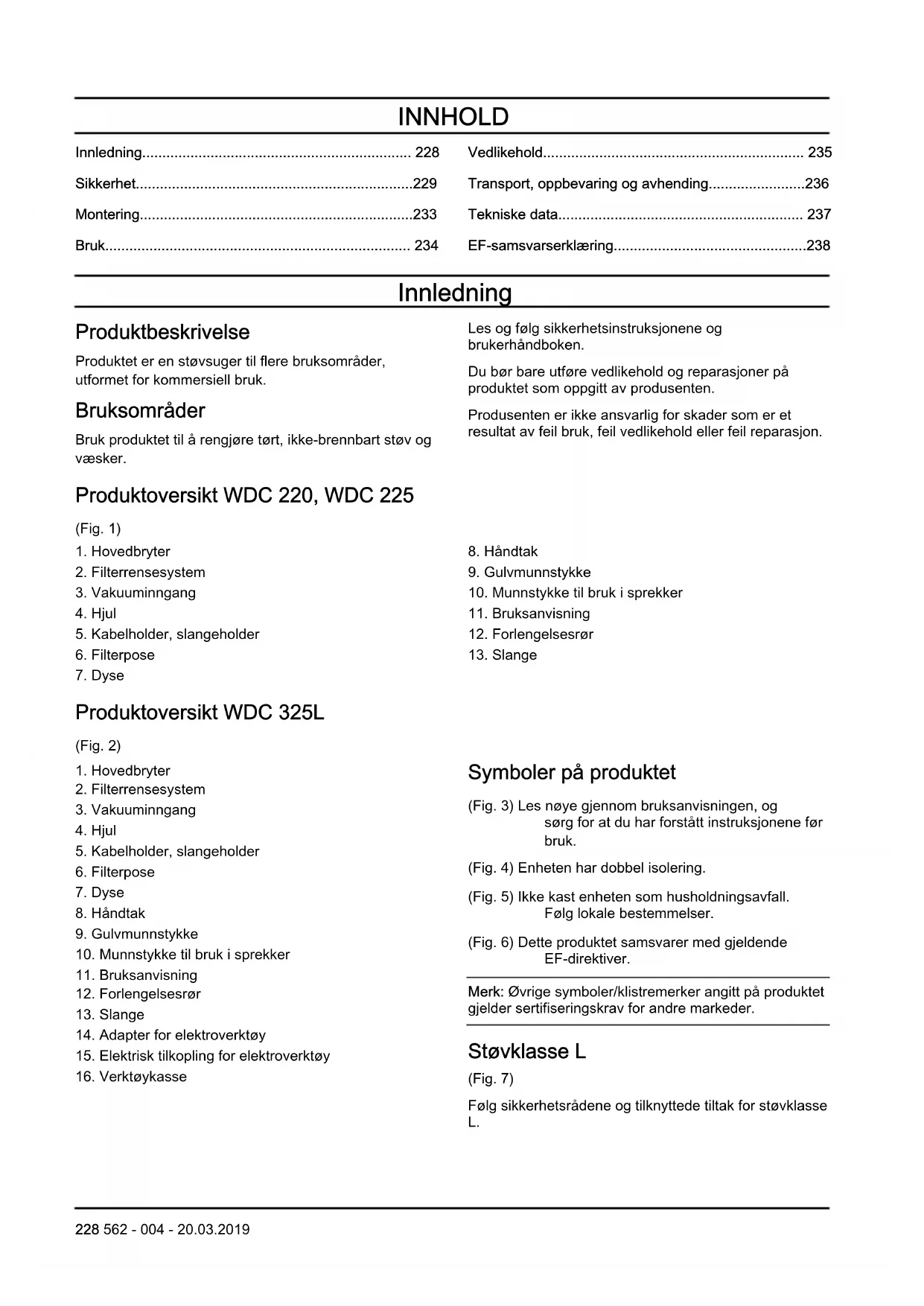 - EF-samsvarserklæring Innledning Produktbeskrivelse Produktet er en støvsuger til flere bruksområder, utformet for kommersiell bruk. Bruksområder Bruk produktet til å rengjøre tørt, ikke-brennbart støv og væsker. Les og følg sikkerhetsinstruksjonene og brukerhåndboken. Du bør bare utføre vedlikehold og reparasjoner på produktet som oppgitt av produsenten. Produsenten er ikke ansvarlig for skader som er et resultat av feil bruk, feil vedlikehold eller feil reparasjon. Produktoversikt WDC 220, WDC 225 (Fig. 1) p. 238