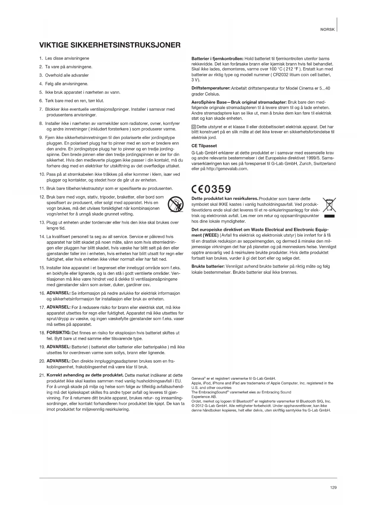Korrekt avhending av dette produktet. Dette merket indikerer at dette produktet ikke skal kastes sammen med vanlig husholdningsavfall i EU. For å unngå skade på miljø og helse som følge av tilfeldig avfallsavhend- ing må det kjøleskapet skilles fra andre typer avfall og leveres til gjen- vinning. For å returnere ditt brukte apparat, brukes retur- og innsamling- sordninger, eller kontakt forhandleren hvor produktet ble kjøpt. De kan ta imot produktet for miljøvennlig resirkulering. Batterier i fjernkontrollen: Hold batteriet til fjernkontrollen utenfor barns rekkevidde. Det kan forårsake brann eller kjemisk brann hvis feil behandlet. Skal ikke lades, demonteres, varme over 100 °C ( 212 °F ). Erstatt kun med batterier av riktig type og modell nummer ( CR2032 litium coin cell batteri, 3 V ). Driftstemperaturer: Anbefalt driftstemperatur for Model Cinema er 5...40 grader Celsius. AeroSphère Base—Bruk original strømadapter: Bruk bare den med- følgende originale strømadapteren til å levere strøm til og å lade enheten. Andre strømadaptere kan se like ut, men å bruke dem kan føre til elektrisk støt og kan skade enheten. Dette utstyret er et klasse II eller dobbeltisolert elektrisk apparat. Det har blitt konstruert på en slik måte at det ikke krever en sikkerhetsforbindelse til elektrisk jord. CE Tilpasset G-Lab GmbH erklærer at dette produktet er i samsvar med essensielle krav og andre relevante bestemmelser i det Europeiske direktivet 1999/5. Sams- varserklæringen kan ses på forespørsel til G-Lab GmbH, Zurich, Switzerland eller på http://genevalab.com. Dette produktet kan resirkuleres. Produkter som bærer dette symbolet skal IKKE kastes i vanlig husholdningsavfall. Ved produk- tlevetidens ende skal det leveres til et re-sirkuleringsanlegg for elek- trisk og elektronisk avfall. Les mer om retur og oppsamlingspunkter hos dine lokale myndigheter. Det europeiske direktivet om Waste Electrical and Electronic Equip- ment ( WEEE ) ( Avfall fra elektrisk og elektronisk utstyr ) ble innført for å få til en drastisk reduksjon av søppelmengden, og dermed å minske den mil- jømessige virkningen det har på planeten og på menneskers helse. Vennligst opptre ansvarlig ved å resirkulere brukte produkter. Hvis dette produktet fortsatt kan brukes, vurder å gi det bort eller og selge det. Brukte batterier: Vennligst avhend brukte batterier på riktig måte og følg lokale bestemmelser. Brukte batterier skal ikke brennes. Geneva