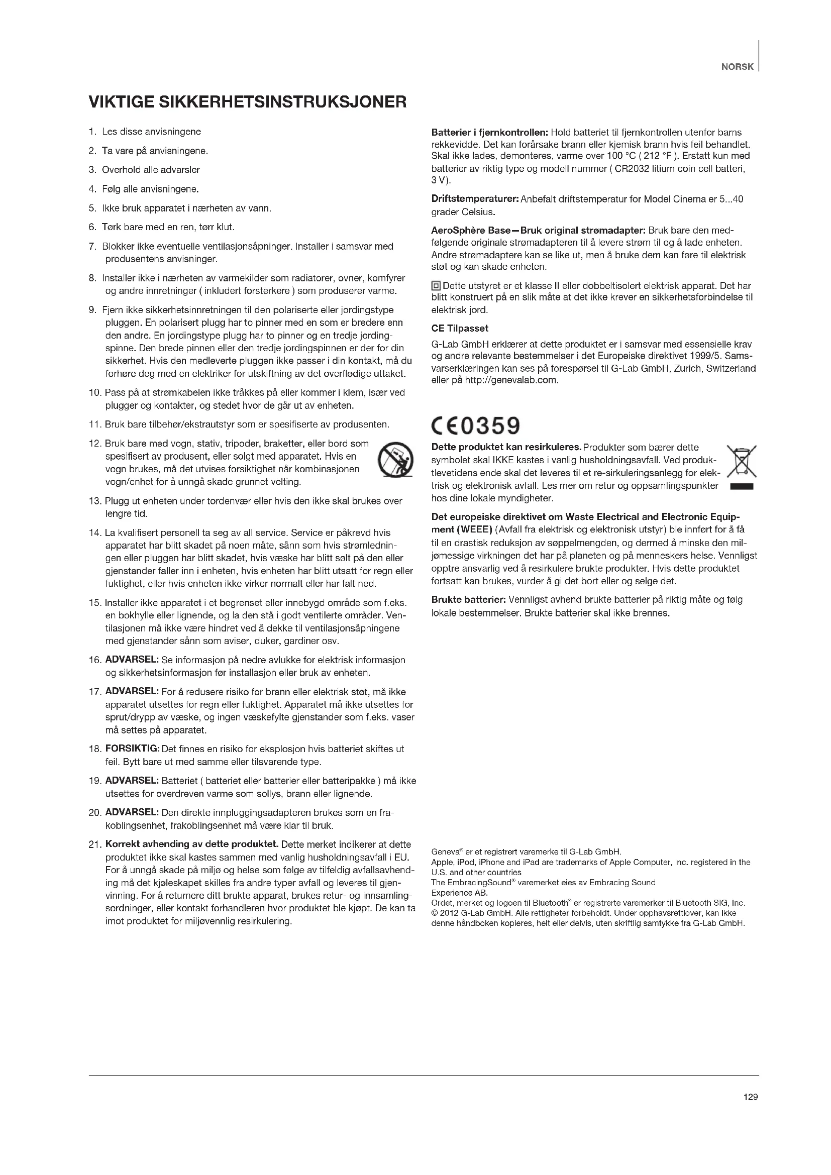 G-Lab GmbH erklærer at dette Produkkt er i samsvar med essensielle krav og andre relevante bestemmelsei det Europeiske direktivet 1999/5. Samsvarserklæringen kan ses pa foresporseI til G-Lab GmbH, Zurich, Switzerland erla http://genevalab.com.