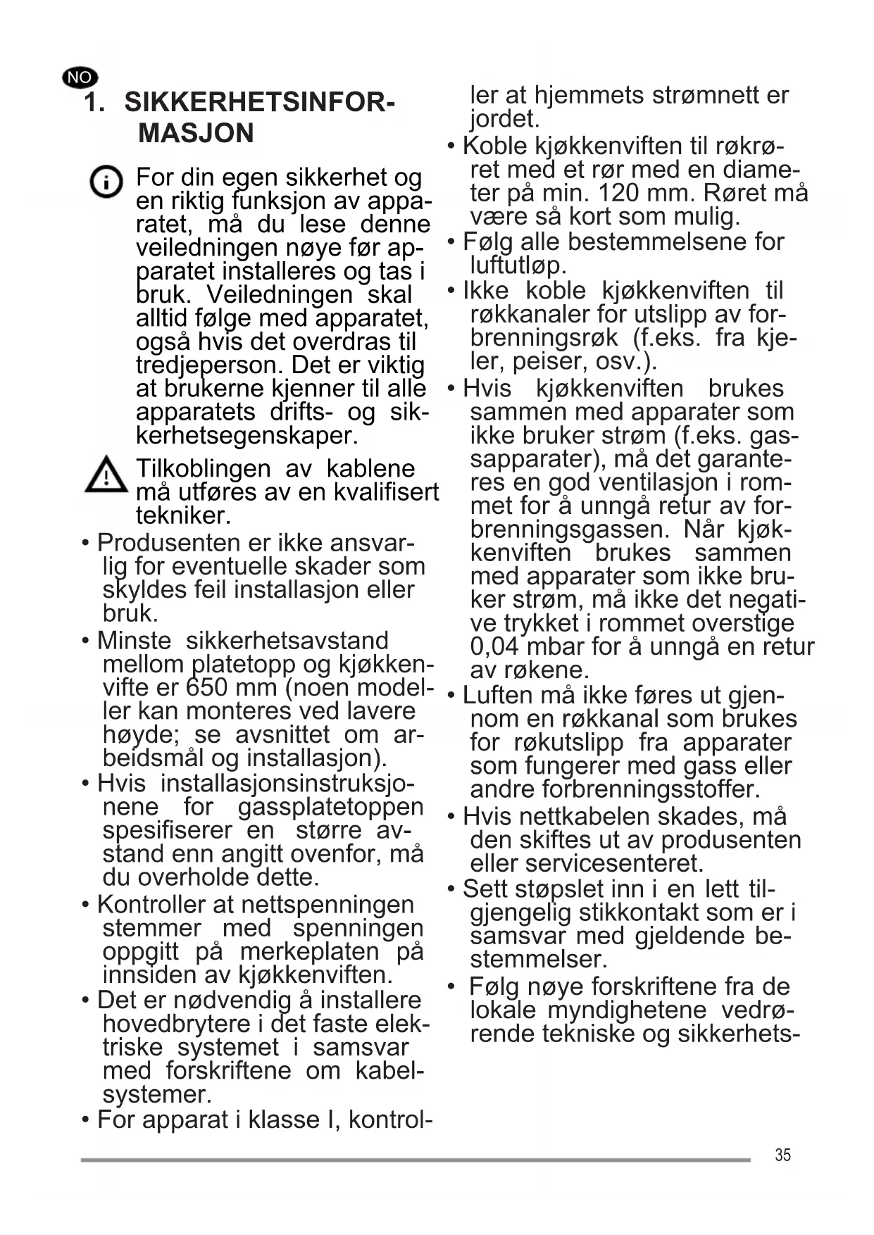 - Ikke koble kjøkkenviften til røkkanaler for utslipp av for- brenningsrøk (f.eks. fra kje- ler, peiser, osv.).