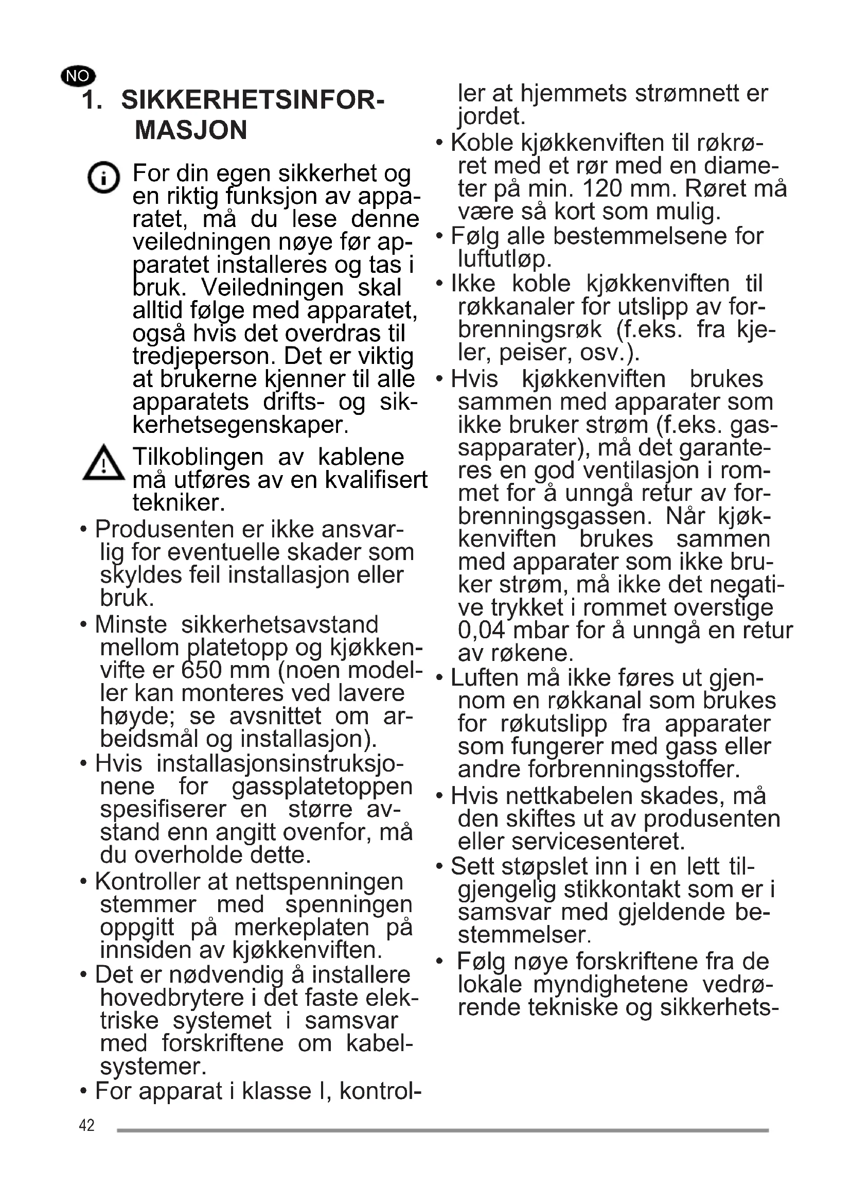 - Hvis kjøkkenviften brukes sammen med apparater som ikke bruker strøm (f.eks. gas- sapparater), må det garante- res en god ventilasjon i rom- met for å unngå retur av for- brenningsgassen. Når kjøk- kenviften brukes sammen med apparater som ikke bru- ker strøm, må ikke det negati- ve trykket i rommet overstige 0,04 mbar for å unngå en retur av røkene.