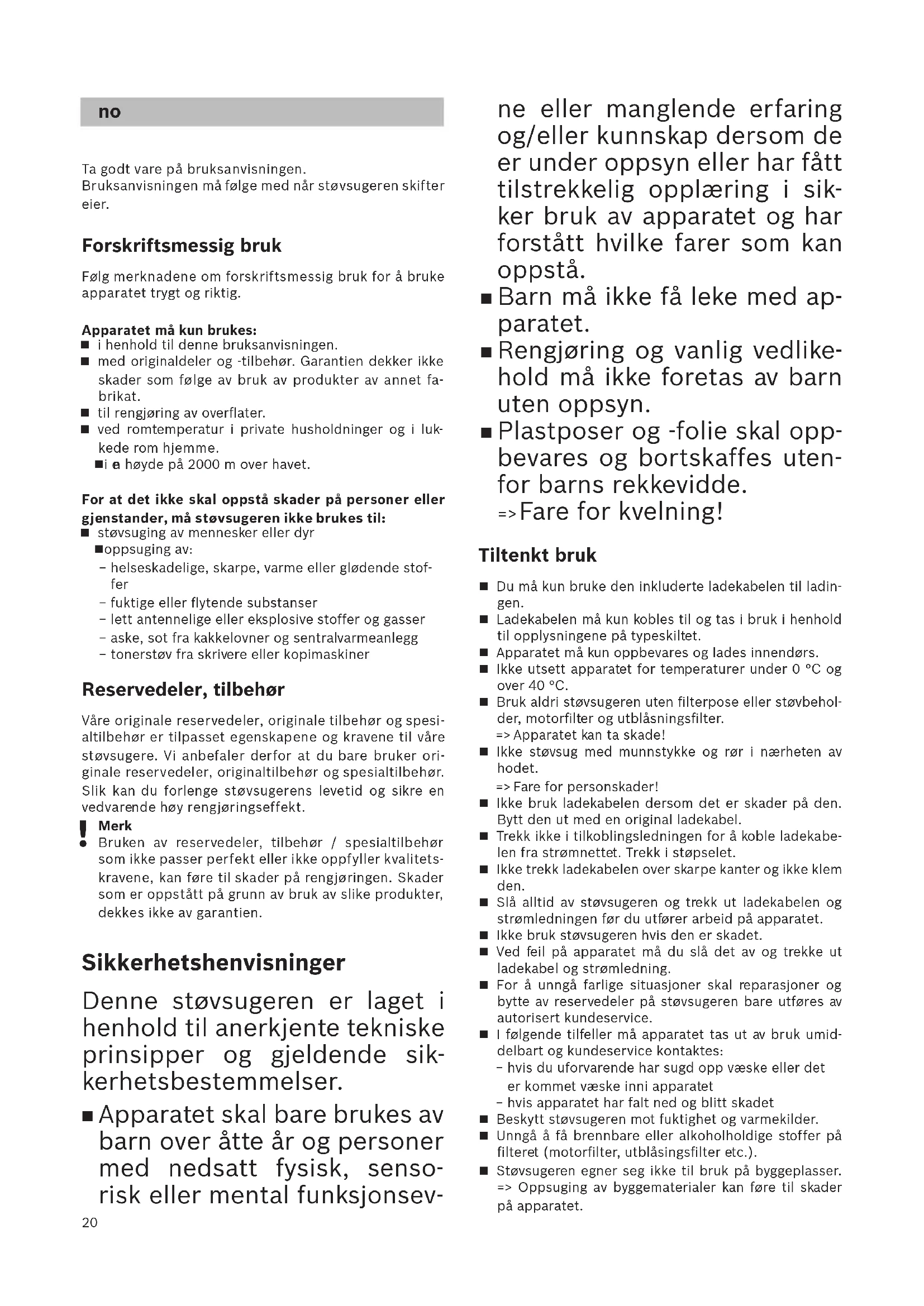 Ta godt vare på bruksanvisningen. Bruksanvisningen må følge med når støvsugeren skifter eier. Forskriftsmessig bruk Følg merknadene om forskriftsmessig bruk for å bruke apparatet trygt og riktig.Apparatet må kun brukes: i henhold til denne bruksanvisningen. med originaldeler og -tilbehør. Garantien dekker ikke skader som følge av bruk av produkter av annet fa- brikat. til rengjøring av overflater. ved romtemperatur i private husholdninger og i luk- kede rom hjemme. i e n høyde på 2000 m over havet. For at det ikke skal oppstå skader på personer eller gjenstander, må støvsugeren ikke brukes til: støvsuging av mennesker eller dyr oppsuging av: −helseskadelige, skarpe, varme eller glødende stof- fer − fuktige eller flytende substanser −lett antennelige eller eksplosive stoffer og gasser − aske, sot fra kakkelovner og sentralvarmeanlegg −tonerstøv fra skrivere eller kopimaskiner Reservedeler, tilbehør Våre originale reservedeler, originale tilbehør og spesi- altilbehør er tilpasset egenskapene og kravene til våre støvsugere . Vi anbefaler derfor at du bare bruker ori- ginale reservedeler, originaltilbehør og spesialtilbehør. Slik kan du forlenge støvsugerens levetid og sikre en vedvare nde høy rengjøringseffekt.