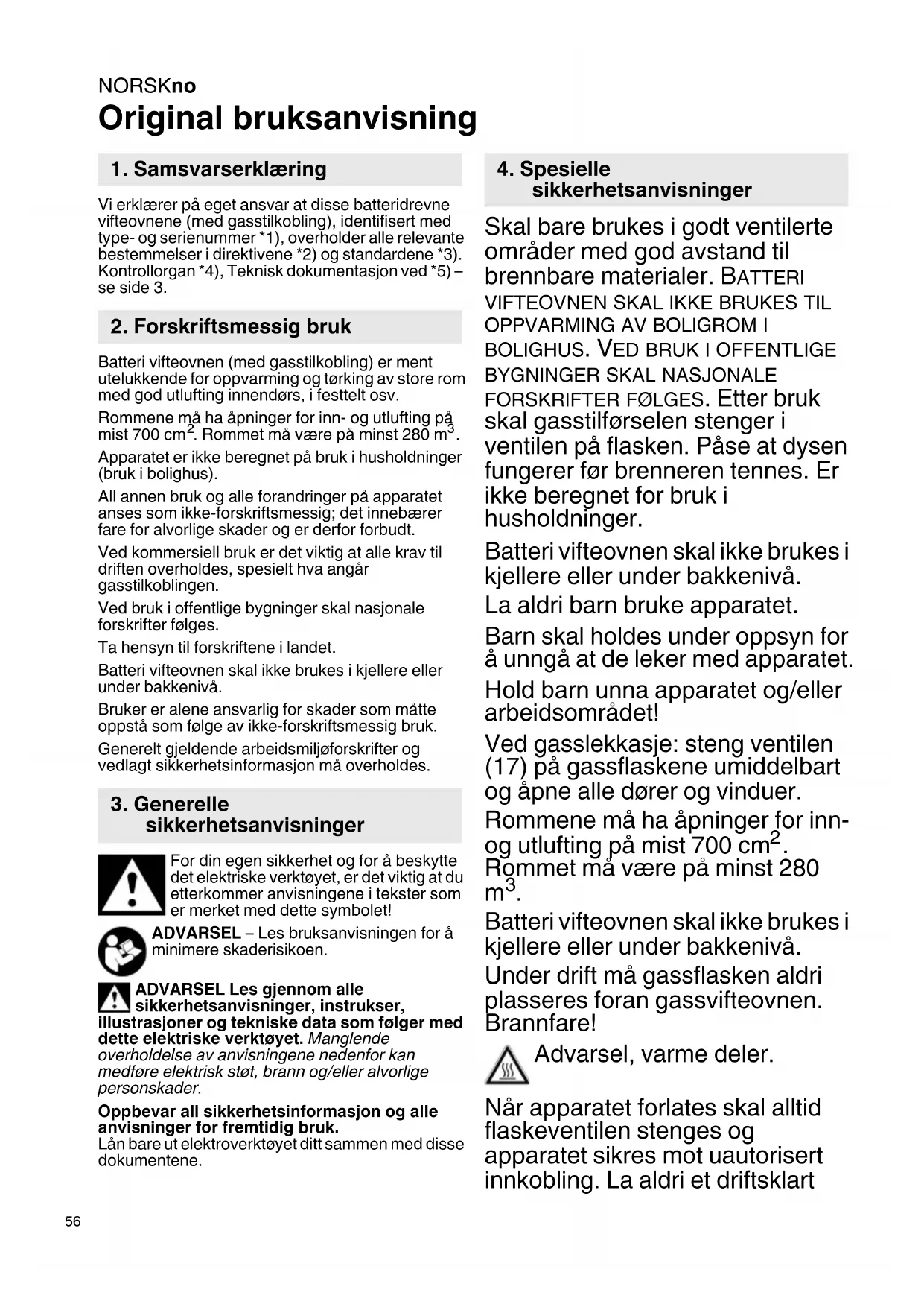 Original bruksanvisning Vi erklærer på eget ansvar at disse batteridrevne vifteovnene (med gasstilkobling), identifisert med type- og serienummer *1), overholder alle relevante bestemmelser i direktivene *2) og standardene *3). Kontrollorgan *4), Teknisk dokumentasjon ved *5) – se side 3. Batteri vifteovnen (med gasstilkobling) er ment utelukkende for oppvarming og tørking av store rom med god utlufting innendørs, i festtelt osv. Rommene må ha åpninger for inn- og utlufting på mist 700 cm