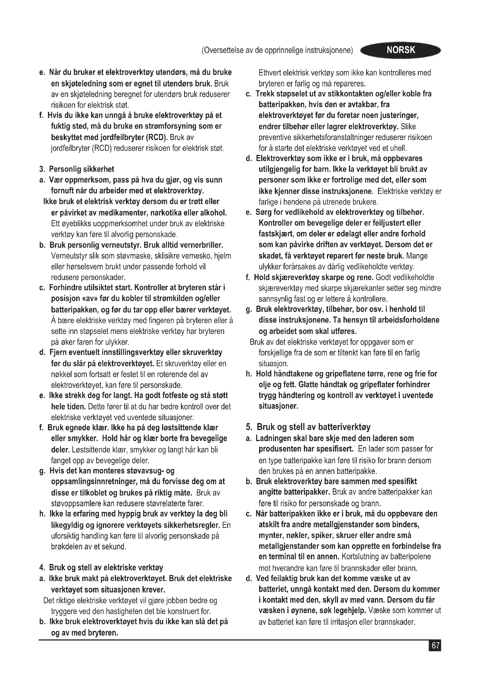 a. Støpselet til verktøyet må passe til stikkontakten. Aldri modiser støpselet på noen måte. Ikke bruk adapterstøpsler til jordede elektriske verktøy. Umodiserte støpsler og stikkontakter som passer vil redusere risikoen for elektrisk sjokk. b. Unngå kroppskontakt med jordede overater som rør, radiatorer, komfyrer og kjøleskap. Det er økt risiko for elektrisk støt dersom kroppen din er jordet. c. Ikke utsett elektroverktøy for regn eller fuktighet. Dersom det kommer vann inn i et elektrisk verktøy vil det øke risikoen for elektrisk sjokk. d. Unngå uforsvarlig behandling av ledningen. Aldri bruk ledningen til å bære, trekke eller dra ut støpselet til det elektriske verktøyet. Hold ledningen borte fra varme, olje, skarpe kanter eller bevegelige deler. Skadede eller innviklede ledninger øker risikoen for elektrisk sjokk.67 (Oversettelse av de opprinnelige instruksjonene) NORSK e. Når du bruker et elektroverktøy utendørs, må du bruke en skjøteledning som er egnet til utendørs bruk. Bruk av en skjøteledning beregnet for utendørs bruk reduserer risikoen for elektrisk støt. f. Hvis du ikke kan unngå å bruke elektroverktøy på et fuktig sted, må du bruke en strømforsyning som er beskyttet med jordfeilbryter (RCD). Bruk av jordfeilbryter (RCD) reduserer risikoen for elektrisk støt.