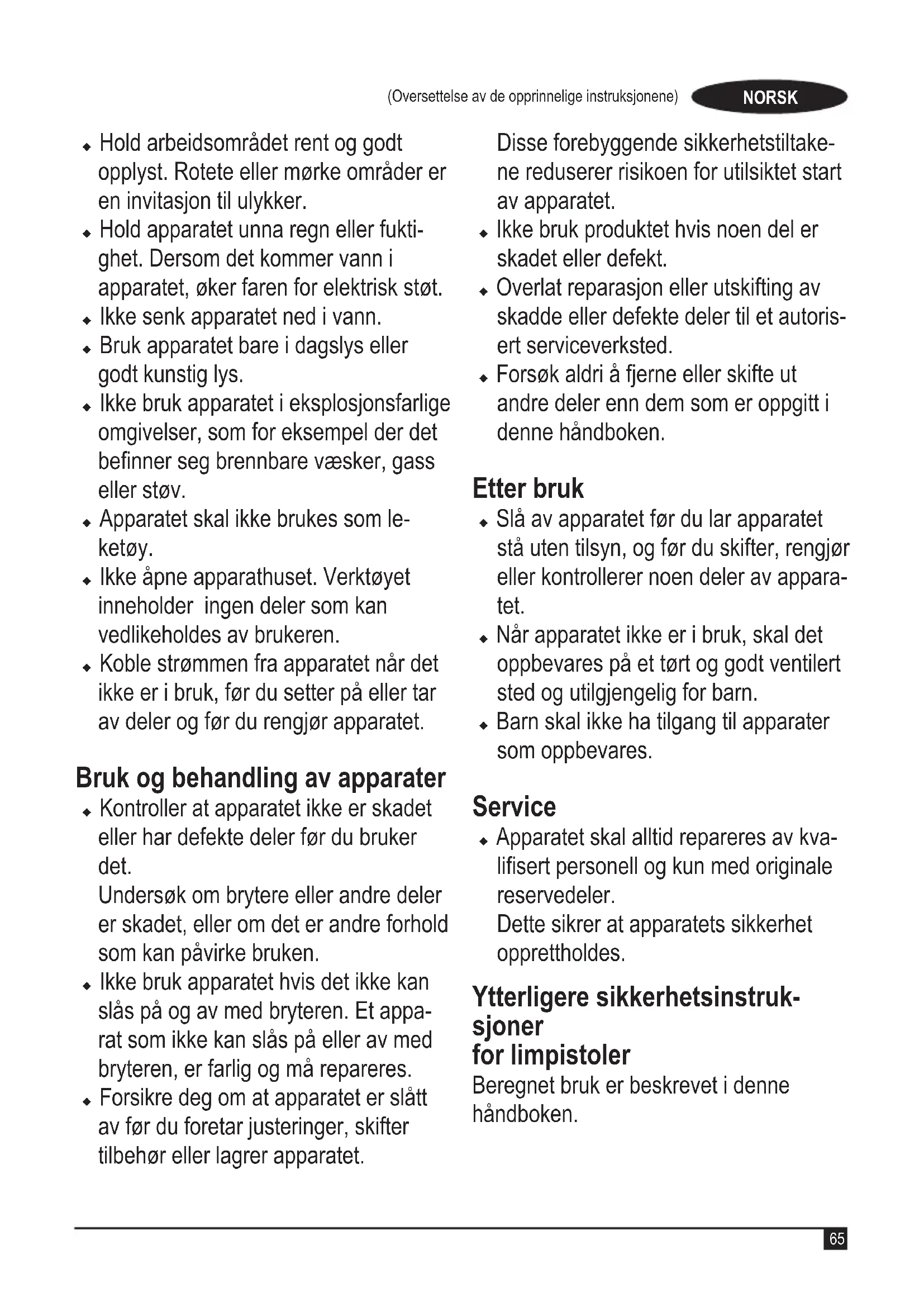 (Översättning av originalanvis- ningarna) SVENSKA (Oversettelse av de opprinnelige instruksjonene) NORSKu Hold arbeidsområdet rent og godt opplyst. Rotete eller mørke områder er en invitasjon til ulykker. u Hold apparatet unna regn eller fukti- ghet. Dersom det kommer vann i apparatet, øker faren for elektrisk støt. u Ikke senk apparatet ned i vann. u Bruk apparatet bare i dagslys eller godt kunstig lys. u Ikke bruk apparatet i eksplosjonsfarlige omgivelser, som for eksempel der det benner seg brennbare væsker, gass eller støv. u Apparatet skal ikke brukes som le- ketøy. u Ikke åpne apparathuset. Verktøyet inneholder ingen deler som kan vedlikeholdes av brukeren. u Koble strømmen fra apparatet når det ikke er i bruk, før du setter på eller tar av deler og før du rengjør apparatet. Bruk og behandling av apparater u Kontroller at apparatet ikke er skadet eller har defekte deler før du bruker det. Undersøk om brytere eller andre deler er skadet, eller om det er andre forhold som kan påvirke bruken. u Ikke bruk apparatet hvis det ikke kan slås på og av med bryteren. Et appa- rat som ikke kan slås på eller av med bryteren, er farlig og må repareres. u Forsikre deg om at apparatet er slått av før du foretar justeringer, skifter tilbehør eller lagrer apparatet. Disse forebyggende sikkerhetstiltake- ne reduserer risikoen for utilsiktet start av apparatet. u Ikke bruk produktet hvis noen del er skadet eller defekt. u Overlat reparasjon eller utskifting av skadde eller defekte deler til et autoris- ert serviceverksted. u Forsøk aldri å fjerne eller skifte ut andre deler enn dem som er oppgitt i denne håndboken. Etter bruk u Slå av apparatet før du lar apparatet stå uten tilsyn, og før du skifter, rengjør eller kontrollerer noen deler av appara- tet. u Når apparatet ikke er i bruk, skal det oppbevares på et tørt og godt ventilert sted og utilgjengelig for barn. u Barn skal ikke ha tilgang til apparater som oppbevares. Service u Apparatet skal alltid repareres av kva- lisert personell og kun med originale reservedeler. Dette sikrer at apparatets sikkerhet opprettholdes. Ytterligere sikkerhetsinstruk- sjoner for limpistoler Beregnet bruk er beskrevet i denne håndboken. (Oversettelse av de opprinnelige instruksjonene) NORSK 65Hvis du bruker annet tilbehør, kobler til annet utstyr eller bruker dette produktet til andre oppgaver enn det som er anbefalt i denne håndboken, kan det føre til fare for personskade og/eller skade på eiendom. u Brann kan oppstå dersom verktøyet ikke brukes forsiktig, derfor: u Vær forsiktig ved bruk av verktøyet på steder der det nnes brennbart materiale. u Ikke før luftstrålen mot samme sted i lang tid. u Skal ikke brukes der det forekommer eksplosiv atmosfære. u Vær klar over at varme kan bli ledet til brennbare materialer du ikke ser. u La alltid apparatet bli avkjølt før lagring. u Ikke la apparatet være uten tilsyn når det er på. u Ikke berør den oppvarmede dysen på limpistolen. Driftstemperaturen på dette apparatet er ca. 199 °C. u Hold hendene borte fra det varme tilbehøret og arbeidsområdet. Varme kan ledes gjennom arbeidsstykket. Bruk skruetvinger eller rørtang for å holde fast arbeidsstykket. u Varmeelementet begynner å varmes opp så snart apparatet kobles til strømmen. For å unngå personskader eller materi- elle skader, gå alltid ut fra at verktøyet er varmt. u Beskytt arbeidsoveraten og ma- terialene mot varmeskader. Varme kan ledes gjennom arbeidsstykket. Bruk varmebestandig materiale for å beskytte arbeidsoveraten. u Limstifter er ikke beregnet på å inntas og bør ikke komme i kontakt med mat, etc.Dersom det svelges, søk medisinsk hjelp. Oppbevar det utilgjengelig for barn. u La apparatet kjøle seg ned før ren- gjøring. u Du må aldri prøve å fremskynde kjølingen av apparatet ved å senke noen del av det ned i vann eller annen væske Gi bare apparatet anledning til å luftkjøles. u Hold apparatet på avstand fra brennbare materialer. Vær opp- merksom på at dette produktet kan antenne materiale. Er du bekymret for dette, kan du teste det på et stykke avfallsmateriale. u La apparatet aldri stå uten tilsyn. Etter bruk, la apparatet kjøle seg ned og oppbevar det ¨på et trygt sted som er utilgjengelig for barn. u Røyk som oppstår under arbeider med verktøyet kan være farlige. Du må alltid arbeide i et godt ventilert område. Innhent råd om materialene som brukes. u Du må aldri prøve å føre annet materiale enn anbefalte limstifter i limpistolen. For eksempel: Ikke prøv å smelte fargestifter eller stearinlys. u IKKE bruk varm smeltelim for å er- statte strukturelle skrueforbindelser og lignende. (Oversettelse av de opprinnelige instruksjonene) NORSK 66u Limstiftene som brukes sammen med denne limpistolen blir myke ved omtrent 60 °C. Ikke bruk lim på andre gjen- stander eller materialer som utsettes for varme. u Unngå utilsiktet utmating av lim. Dersom limstiftene presses inn i et ikke oppvarmet apparat, kan apparatet bli skadet, eller det kan brått komme varm lim ut av dysen når driftstempe- raturen nås. Det kan komme lim ut av et oppvarmet apparat uten at avtrekke- ren betjenes (1). Bruk varmebestandig materiale for å beskytte arbeidsovera- ten. u Apparatet er ikke et leketøy. Oppbe- var det utilgjengelig for barn. u Apparatet må bare brukes med strømforsyningsenheten. Strømspe- nningen inn i apparatet må være i henhold til markeringen på apparatet. Andre personers sikkerhet u Dette apparatet kan brukes av barn som er 8 år eller eldre samt av perso- ner som har reduserte fysiske, sanse- messige eller mentale evner, eller som mangler erfaring og kunnskap, hvis de har tilsyn eller har fått veiledning i bruk av apparatet på en trygg måte og forstår farene som foreligger. Barn skal ikke leke med apparatet. Rengjøring og brukervedlikehold skal ikke utføres av barn uten tilsyn. u Barn må holdes under oppsyn, sørg for at de ikke leker med apparatet. M