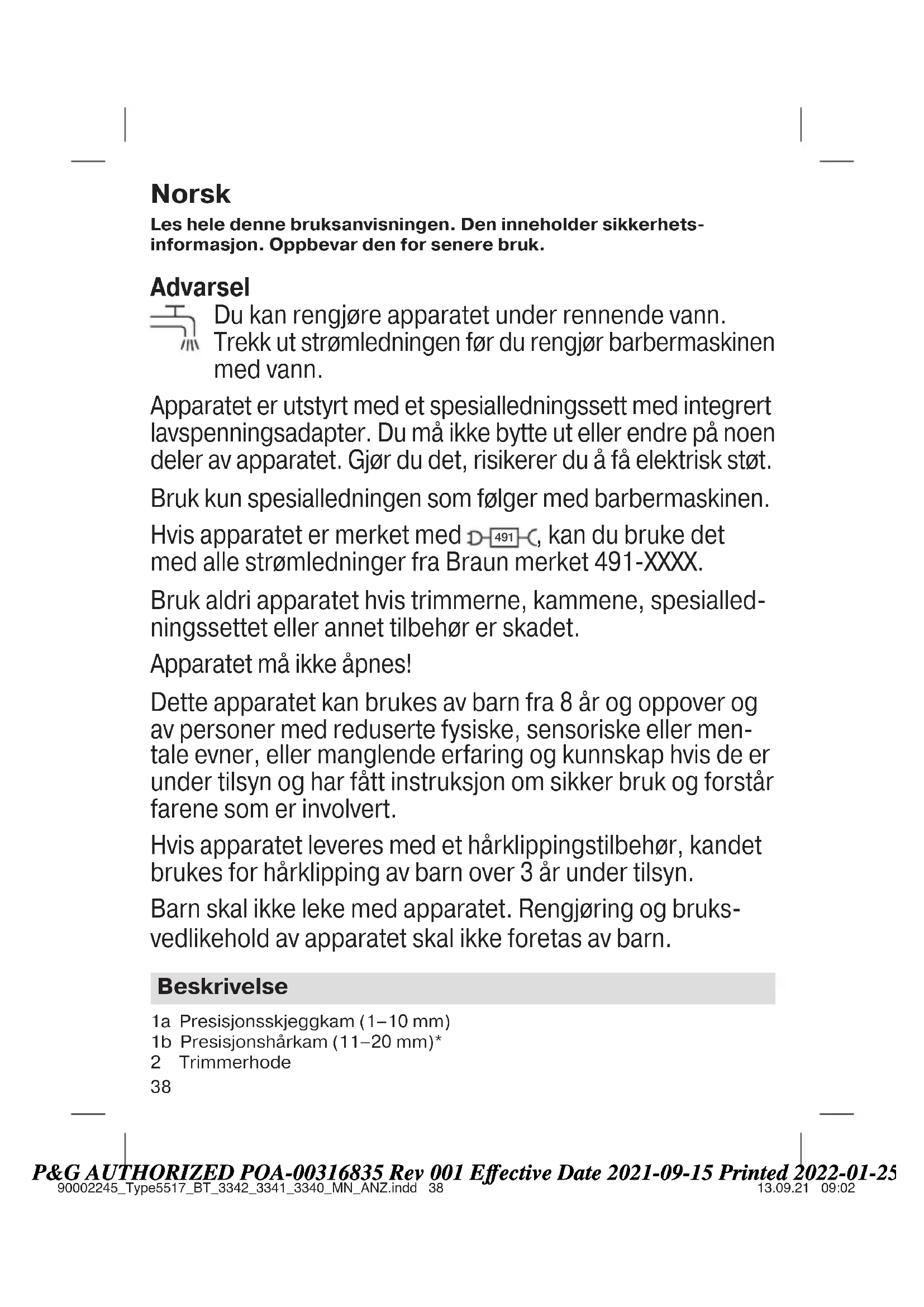 , kan du bruke det med alle strømledninger fra Braun merket 491-XXXX. Bruk aldri apparatet hvis trimmerne, kammene, spesialled- ningssettet eller annet tilbehør er skadet. Apparatet må ikke åpnes! Dette apparatet kan brukes av barn fra 8 år og oppover og av personer med reduserte fysiske, sensoriske eller men- tale evner, eller manglende erfaring og kunnskap hvis de er under tilsyn og har fått instruksjon om sikker bruk og forstår farene som er involvert. Hvis apparatet leveres med et hårklippingstilbehør, kandet brukes for hårklipping av barn over 3 år under tilsyn. Barn skal ikke leke med apparatet. Rengjøring og bruks- vedlikehold av apparatet skal ikke foretas av barn. Beskrivelse 1a Presisjonsskjeggkam (1–10 mm) 1b Presisjonshårkam (11–20 mm)* 2 Trimmerhode 90002245_Type5517_BT_3342_3341_3340_MN_ANZ.indd 3890002245_Type5517_BT_3342_3341_3340_MN_ANZ.indd 38 13.09.21 09:0213.09.21 09:02 Business Use - P&G AUTHORIZED POA-00316835 Rev 001 Effective Date 2021-09-15 Printed 2022-01-25 Page 38 of 5239 3 Lengdeinnstilling 4 På/av-knapp 5 Ladeindikator 6 Kontakt 7 Spesialledning (utseendet kan variere)