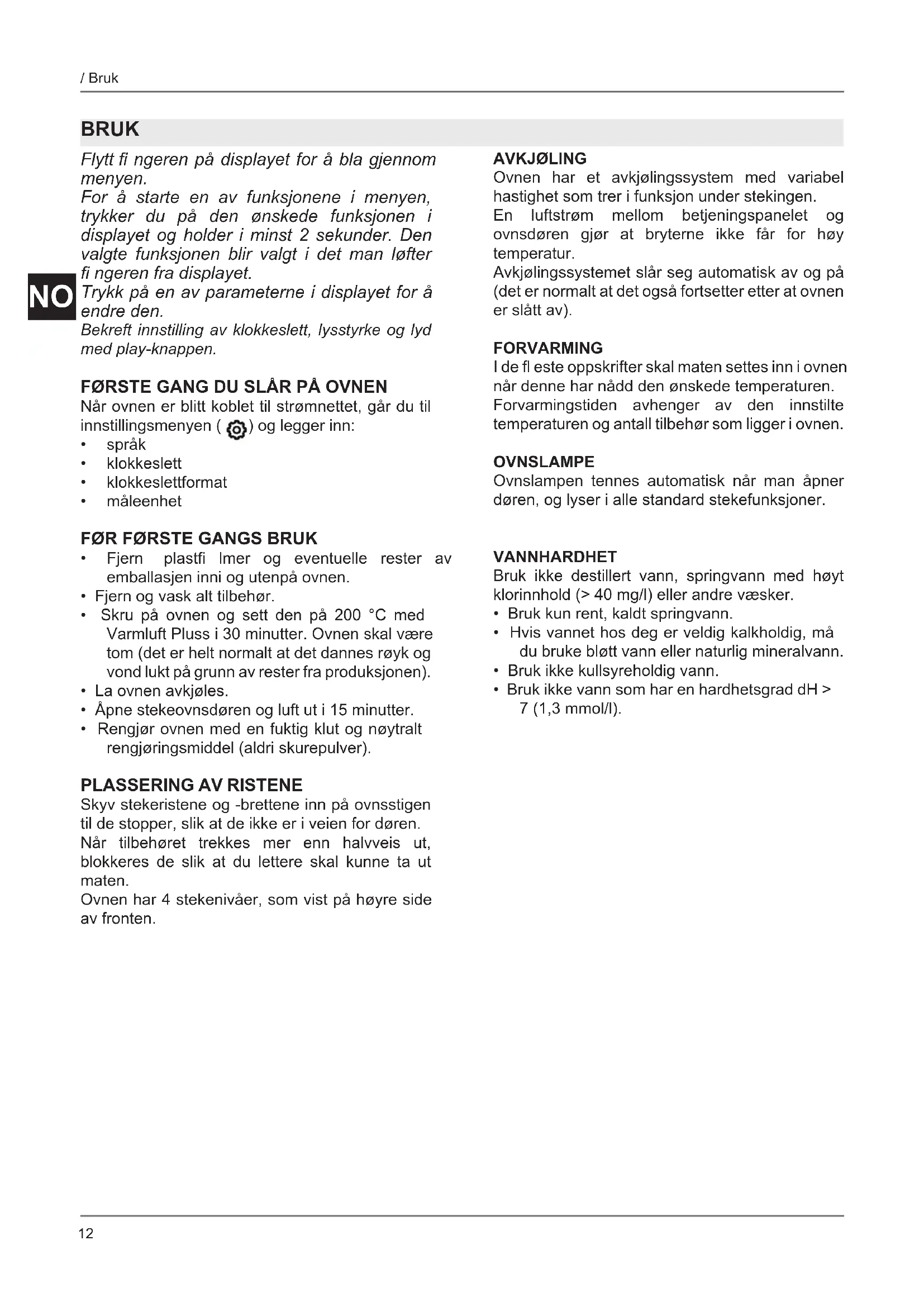 Skyv stekeristene og -brettene inn på ovnsstigen til de stopper, slik at de ikke er i veien for døren. Når tilbehøret trekkes mer enn halvveis ut, blokkeres de slik at du lettere skal kunne ta ut maten. Ovnen har 4 stekenivåer, som vist på høyre side av fronten. AVKJØLING Ovnen har et avkjølingssystem med variabel hastighet som trer i funksjon under stekingen. En luftstrøm mellom betjeningspanelet og ovnsdøren gjør at bryterne ikke får for høy temperatur. Avkjølingssystemet slår seg automatisk av og på (det er normalt at det også fortsetter etter at ovnen er slått av). FORVARMING I de fl este oppskrifter skal maten settes inn i ovnen når denne har nådd den ønskede temperaturen. Forvarmingstiden avhenger av den innstilte temperaturen og antall tilbehør som ligger i ovnen. OVNSLAMPE Ovnslampen tennes automatisk når man åpner døren, og lyser i alle standard stekefunksjoner. VANNHARDHET Bruk ikke destillert vann, springvann med høyt klorinnhold (> 40 mg/l) eller andre væsker.