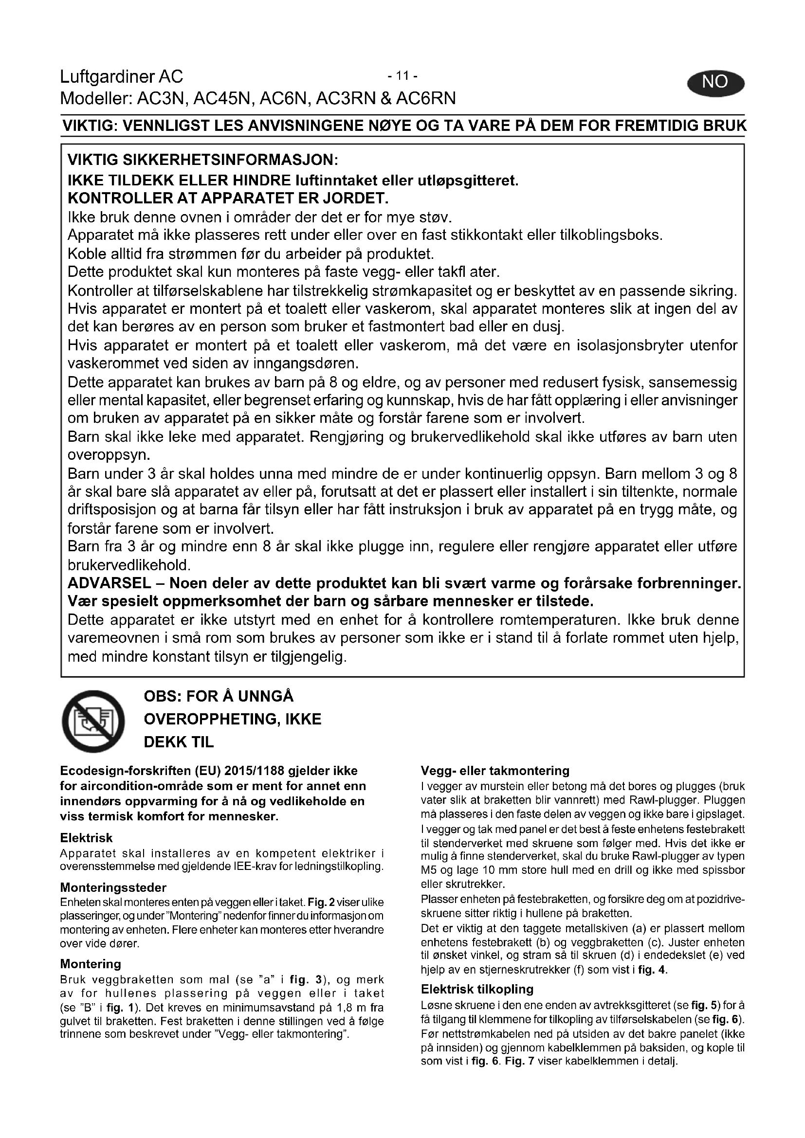 Luftgardiner AC Modeller: AC3N, AC45N, AC6N, AC3RN & AC6RN VIKTIG SIKKERHETSINFORMASJON: IKKE TILDEKK ELLER HINDRE luftinntaket eller utløpsgitteret. KONTROLLER AT APPARATET ER JORDET. Ikke bruk denne ovnen i områder der det er for mye støv. Apparatet må ikke plasseres rett under eller over en fast stikkontakt eller tilkoblingsboks. Koble alltid fra strømmen før du arbeider på produktet. Dette produktet skal kun monteres på faste vegg- eller takfl ater. Kontroller at tilførselskablene har tilstrekkelig strømkapasitet og er beskyttet av en passende sikring. Hvis apparatet er montert på et toalett eller vaskerom, skal apparatet monteres slik at ingen del av det kan berøres av en person som bruker et fastmontert bad eller en dusj. Hvis apparatet er montert på et toalett eller vaskerom, må det være en isolasjonsbryter utenfor vaskerommet ved siden av inngangsdøren. Dette apparatet kan brukes av barn på 8 og eldre, og av personer med redusert fysisk, sansemessig eller mental kapasitet, eller begrenset erfaring og kunnskap, hvis de har fått opplæring i eller anvisninger om bruken av apparatet på en sikker måte og forstår farene som er involvert. Barn skal ikke leke med apparatet. Rengjøring og brukervedlikehold skal ikke utføres av barn uten overoppsyn. Barn under 3 år skal holdes unna med mindre de er under kontinuerlig oppsyn. Barn mellom 3 og 8 år skal bare slå apparatet av eller på, forutsatt at det er plassert eller installert i sin tiltenkte, normale driftsposisjon og at barna får tilsyn eller har fått instruksjon i bruk av apparatet på en trygg måte, og forstår farene som er involvert. Barn fra 3 år og mindre enn 8 år skal ikke plugge inn, regulere eller rengjøre apparatet eller utføre brukervedlikehold. ADVARSEL – Noen deler av dette produktet kan bli svært varme og forårsake forbrenninger. Vær spesielt oppmerksomhet der barn og sårbare mennesker er tilstede. Dette apparatet er ikke utstyrt med en enhet for å kontrollere romtemperaturen. Ikke bruk denne varemeovnen i små rom som brukes av personer som ikke er i stand til å forlate rommet uten hjelp, med mindre konstant tilsyn er tilgjengelig. Ecodesign-forskriften (EU) 2015/1188 gjelder ikke for aircondition-område som er ment for annet enn innendørs oppvarming for å nå og vedlikeholde en viss termisk komfort for mennesker. Elektrisk Apparatet skal installeres av en kompetent elektriker i overensstemmelse med gjeldende IEE-krav for ledningstilkopling. Monteringssteder Enheten skal monteres enten på veggen eller i taket. Fig. 2 viser ulike plasseringer, og under ”Montering” nedenfor fi nner du informasjon om montering av enheten. Flere enheter kan monteres etter hverandre over vide dører. Montering Bruk veggbraketten som mal (se ”a” i fig. 3), og merk av for hullenes plassering på veggen eller i taket (se ”B” i fi g. 1). Det kreves en minimumsavstand på 1,8 m fra gulvet til braketten. Fest braketten i denne stillingen ved å følge trinnene som beskrevet under ”Vegg- eller takmontering”. Vegg- eller takmontering I vegger av murstein eller betong må det bores og plugges (bruk vater slik at braketten blir vannrett) med Rawl-plugger. Pluggen må plasseres i den faste delen av veggen og ikke bare i gipslaget. I vegger og tak med panel er det best å feste enhetens festebrakett til stenderverket med skruene som følger med. Hvis det ikke er mulig å fi nne stenderverket, skal du bruke Rawl-plugger av typen M5 og lage 10 mm store hull med en drill og ikke med spissbor eller skrutrekker. Plasser enheten på festebraketten, og forsikre deg om at pozidrive- skruene sitter riktig i hullene på braketten. Det er viktig at den taggete metallskiven (a) er plassert mellom enhetens festebrakett (b) og veggbraketten (c). Juster enheten til ønsket vinkel, og stram så til skruen (d) i endedekslet (e) ved hjelp av en stjerneskrutrekker (f) som vist i fi g. 4. Elektrisk tilkopling Løsne skruene i den ene enden av avtrekksgitteret (se fi g. 5) for å få tilgang til klemmene for tilkopling av tilførselskabelen (se fi g. 6). Før nettstrømkabelen ned på utsiden av det bakre panelet (ikke på innsiden) og gjennom kabelklemmen på baksiden, og kople til som vist i fi g. 6. Fig. 7 viser kabelklemmen i detalj.