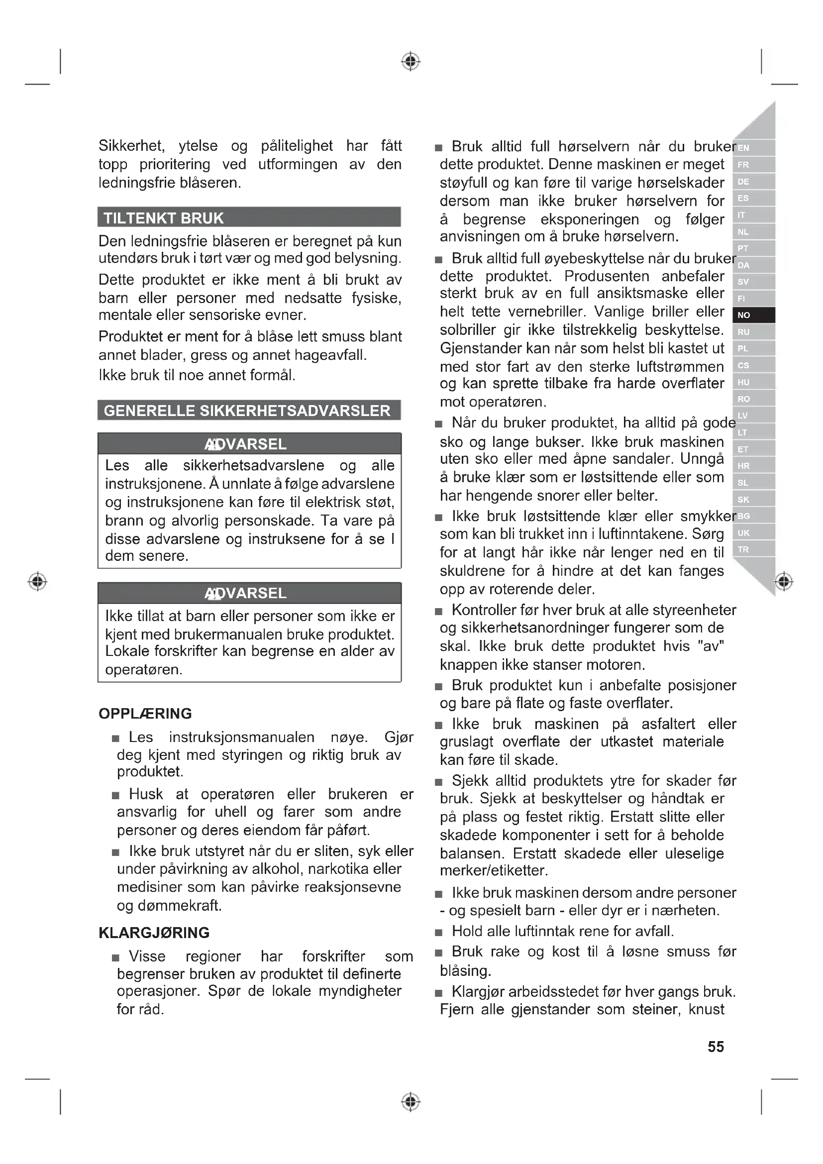 Sikkerhet, ytelse og pålitelighet har fått topp prioritering ved utformingen av den ledningsfrie blåseren. TILTENKT BRUK Den ledningsfrie blåseren er beregnet på kun utendørs bruk i tørt vær og med god belysning. Dette produktet er ikke ment å bli brukt av barn eller personer med nedsatte fysiske, mentale eller sensoriske evner. Produktet er ment for å blåse lett smuss blant annet blader, gress og annet hageavfall. Ikke bruk til noe annet formål. GENERELLE SIKKERHETSADVARSLER ADVARSEL Les alle sikkerhetsadvarslene og alle instruksjonene. Å unnlate å følge advarslene og instruksjonene kan føre til elektrisk støt, brann og alvorlig personskade. Ta vare på disse advarslene og instruksene for å se I dem senere. ADVARSEL Ikke tillat at barn eller personer som ikke er kjent med brukermanualen bruke produktet. Lokale forskrifter kan begrense en alder av operatøren. OPPLÆRING ■ Les instruksjonsmanualen nøye. Gjør deg kjent med styringen og riktig bruk av produktet. ■ Husk at operatøren eller brukeren er ansvarlig for uhell og farer som andre personer og deres eiendom får påført. ■ Ikke bruk utstyret når du er sliten, syk eller under påvirkning av alkohol, narkotika eller medisiner som kan påvirke reaksjonsevne og dømmekraft. KLARGJØRING ■ Visse regioner har forskrifter som begrenser bruken av produktet til definerte operasjoner. Spør de lokale myndigheter for råd. ■ Bruk alltid full hørselvern når du bruker dette produktet. Denne maskinen er meget støyfull og kan føre til varige hørselskader dersom man ikke bruker hørselvern for å begrense eksponeringen og følger anvisningen om å bruke hørselvern. ■ Bruk alltid full øyebeskyttelse når du bruker dette produktet. Produsenten anbefaler sterkt bruk av en full ansiktsmaske eller helt tette vernebriller. Vanlige briller eller solbriller gir ikke tilstrekkelig beskyttelse. Gjenstander kan når som helst bli kastet ut med stor fart av den sterke luftstrømmen og kan sprette tilbake fra harde overflater mot operatøren. ■ Når du bruker produktet, ha alltid på gode sko og lange bukser. Ikke bruk maskinen uten sko eller med åpne sandaler. Unngå å bruke klær som er løstsittende eller som har hengende snorer eller belter. ■ Ikke bruk løstsittende klær eller smykker som kan bli trukket inn i luftinntakene. Sørg for at langt hår ikke når lenger ned en til skuldrene for å hindre at det kan fanges opp av roterende deler. ■ Kontroller før hver bruk at alle styreenheter og sikkerhetsanordninger fungerer som de skal. Ikke bruk dette produktet hvis "av" knappen ikke stanser motoren. ■ Bruk produktet kun i anbefalte posisjoner og bare på flate og faste overflater. ■ Ikke bruk maskinen på asfaltert eller gruslagt overflate der utkastet materiale kan føre til skade. ■ Sjekk alltid produktets ytre for skader før bruk. Sjekk at beskyttelser og håndtak er på plass og festet riktig. Erstatt slitte eller skadede komponenter i sett for å beholde balansen. Erstatt skadede eller uleselige merker/etiketter. ■ Ikke bruk maskinen dersom andre personer - og spesielt barn - eller dyr er i nærheten. ■ Hold alle luftinntak rene for avfall. ■ Bruk rake og kost til å løsne smuss før blåsing. ■ Klargjør arbeidsstedet før hver gangs bruk. Fjern alle gjenstander som steiner, knust56 | Norsk glass, spiker, wire eller hyssing som kan bli slengt lange avstander med stor fart.