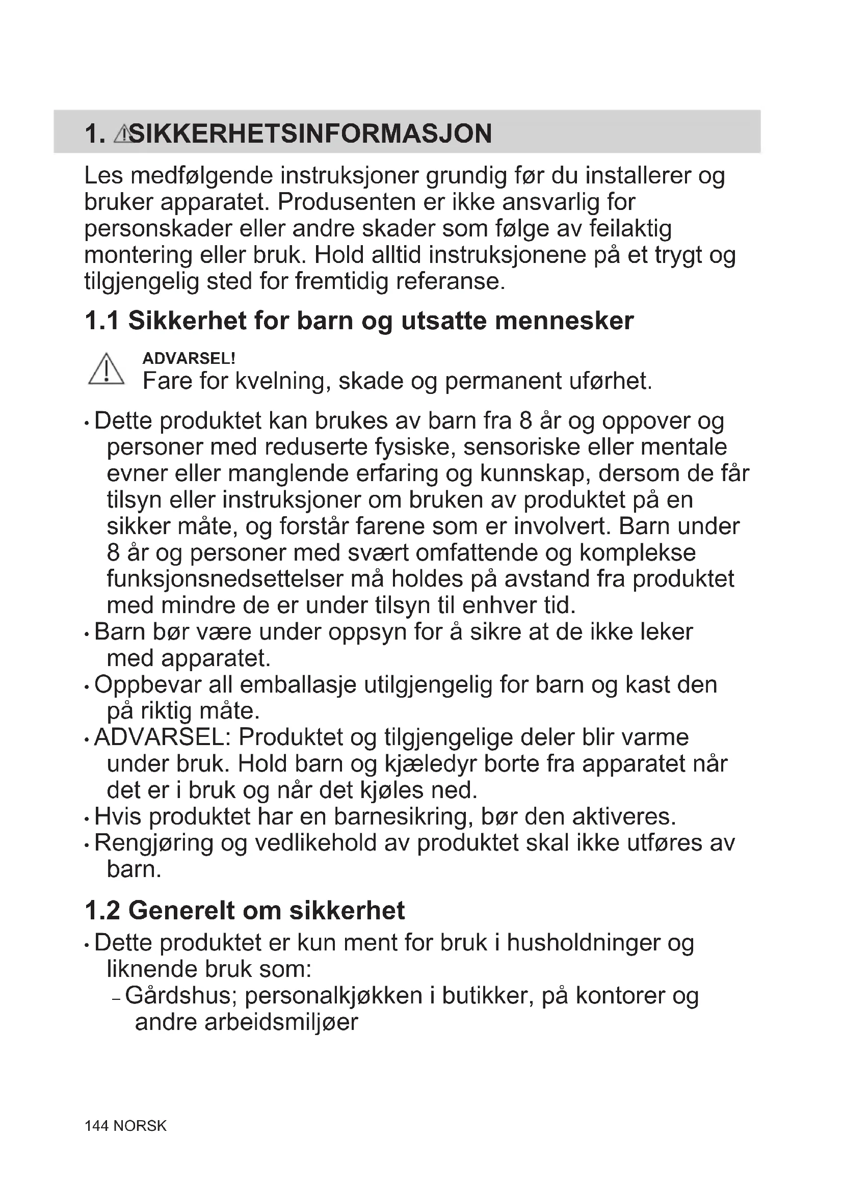 - ADVARSEL: Produktet og tilgjengelige deler blir varme under bruk. Hold barn og kjæledyr borte fra apparatet når det er i bruk og når det kjøles ned.