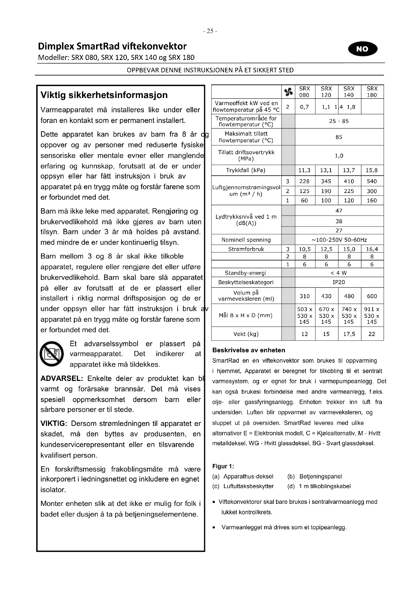 Dimplex SmartRad viekonvektor Modeller: SRX 080, SRX 120, SRX 140 og SRX 180 OPPBEVAR DENNE INSTRUKSJONEN PÅ ET SIKKERT STED Viktig sikkerhetsinformasjon Varmeapparatet må installeres like under eller foran en kontakt som er permanent installert. Dette apparatet kan brukes av barn fra 8 år og oppover og av personer med reduserte fysiske, sensoriske eller mentale evner eller manglende erfaring og kunnskap, forutsatt at de er under oppsyn eller har fått instruksjon i bruk av apparatet på en trygg måte og forstår farene som er forbundet med det. Barn må ikke leke med apparatet. Rengjøring og brukervedlikehold må ikke gjøres av barn uten tilsyn. Barn under 3 år må holdes på avstand. med mindre de er under kontinuerlig tilsyn. Barn mellom 3 og 8 år skal ikke tilkoble apparatet, regulere eller rengjøre det eller utføre brukervedlikehold. Barn skal bare slå apparatet på eller av forutsatt at de er plassert eller installert i riktig normal driftsposisjon og de er under oppsyn eller har fått instruksjon i bruk av apparatet på en trygg måte og forstår farene som er forbundet med det. Et advarselssymbol er plassert på varmeapparatet. Det indikerer at apparatet ikke må tildekkes. ADVARSEL: Enkelte deler av produktet kan bli varmt og forårsake brannsår. Det må vises spesiell oppmerksomhet dersom barn eller sårbare personer er til stede. VIKTIG: Dersom strømledningen til apparatet er skadet, må den byttes av produsenten, en kundeservicerepresentant eller en tilsvarende kvalifisert person. En forskriftsmessig frakoblingsmåte må være inkorporert i ledningsnettet og inkludere en egnet isolator. Monter enheten slik at det ikke er mulig for folk i badet eller dusjen å ta på betjeningselementene. SRX