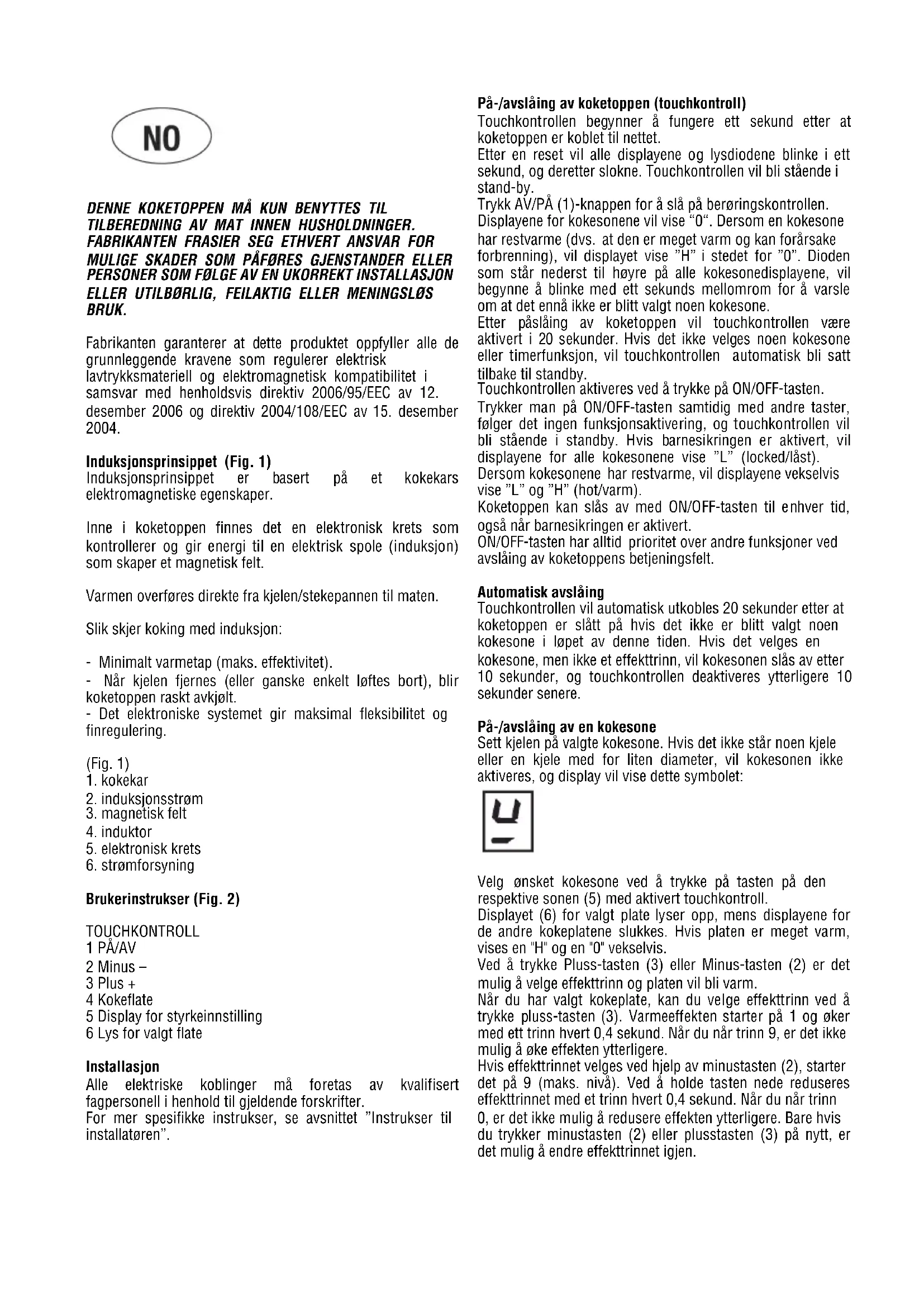 Disse instruksene er til veiledning for installmenten ved montering, justering og vedlikehold av induksjonstoppen. Alt installasjonsarbeid skal utfores etter gjeldende lovgivning og forskritter. Husk Å avbryte strømforsyningen før det foretas ingrep på apparatet.