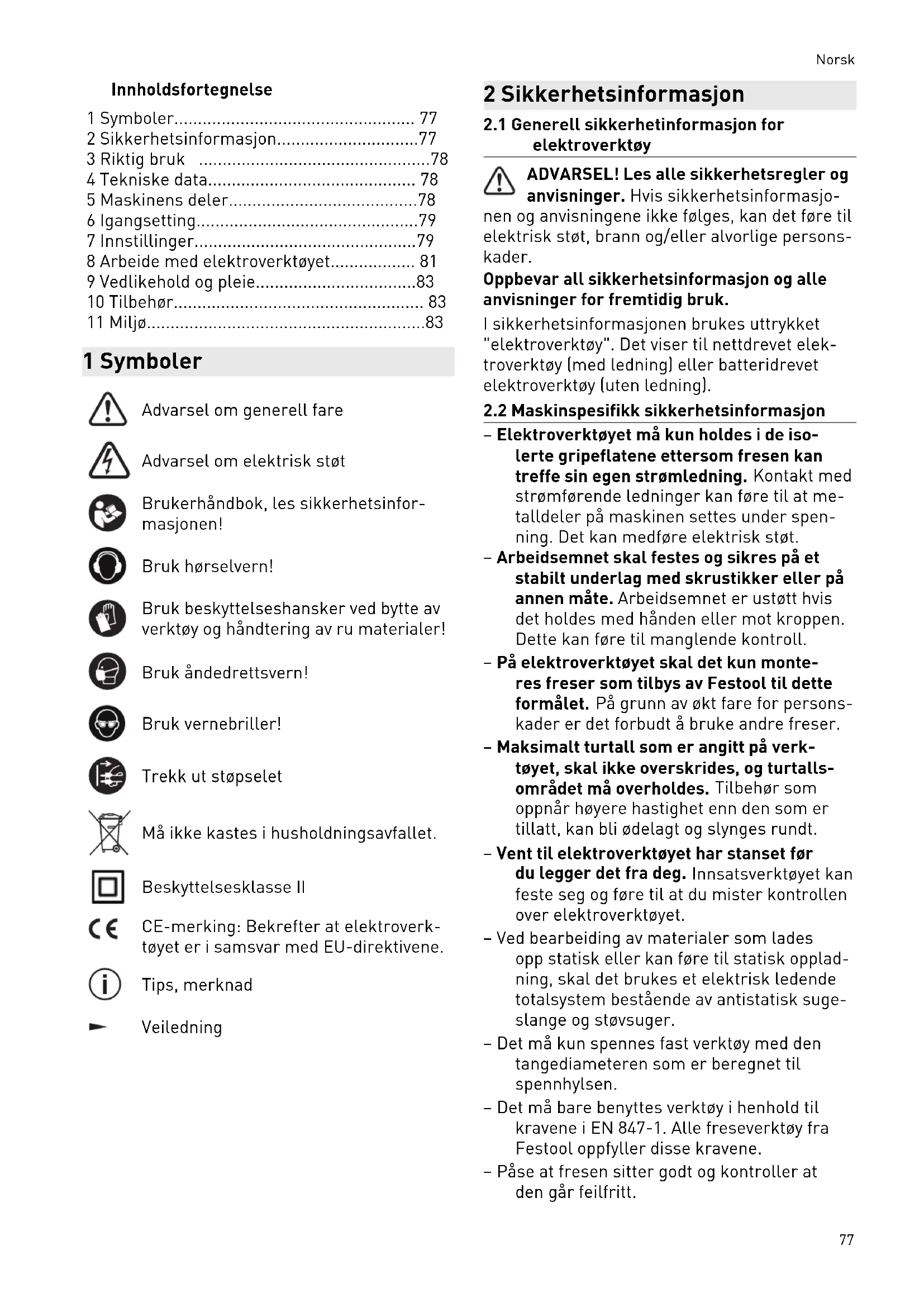 – Elektroverktøyet må kun holdes i de iso lerte gripeflatene ettersom fresen kan treffe sin egen strømledning. Kontakt med strømførende ledninger kan føre til at me talldeler på maskinen settes under spen ning. Det kan medføre elektrisk støt. – Arbeidsemnet skal festes og sikres på et stabilt underlag med skrustikker eller på annen måte. Arbeidsemnet er ustøtt hvis det holdes med hånden eller mot kroppen. Dette kan føre til manglende kontroll. – På elektroverktøyet skal det kun monte res freser som tilbys av Festool til dette formålet. På grunn av økt fare for persons kader er det forbudt å bruke andre freser. – Maksimalt turtall som er angitt på verk tøyet, skal ikke overskrides, og turtalls området må overholdes. Tilbehør som oppnår høyere hastighet enn den som er tillatt, kan bli ødelagt og slynges rundt. – Vent til elektroverktøyet har stanset før du legger det fra deg. Innsatsverktøyet kan feste seg og føre til at du mister kontrollen over elektroverktøyet. – Ved bearbeiding av materialer som lades opp statisk eller kan føre til statisk opplad ning, skal det brukes et elektrisk ledende totalsystem bestående av antistatisk suge slange og støvsuger. – Det må kun spennes fast verktøy med den tangediameteren som er beregnet til spennhylsen. – Det må bare benyttes verktøy i henhold til kravene i EN 847-1. Alle freseverktøy fra Festool oppfyller disse kravene. – Påse at fresen sitter godt og kontroller at den går feilfritt. Norsk 77– Spennhylsen og overfalsmutteren må ikke ha noen skader. – Freser med sprekker og freser som har endret form, må ikke brukes.