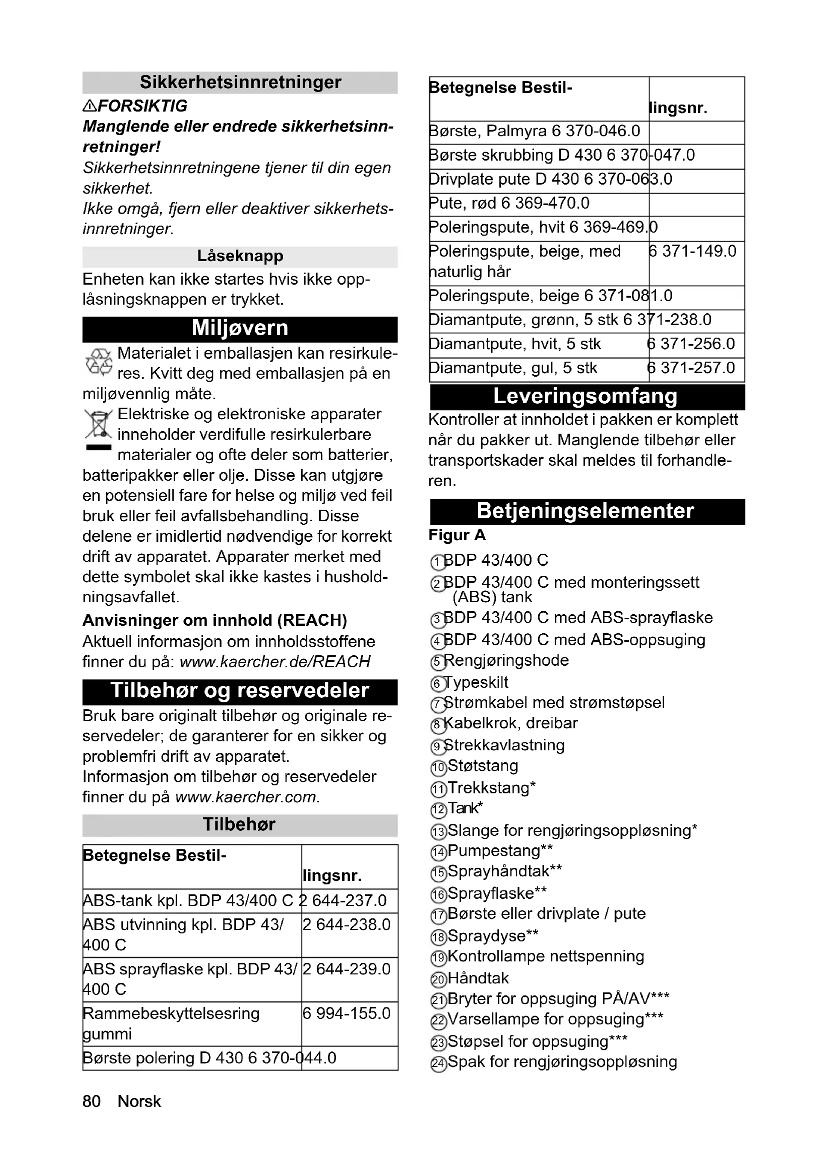 - EU-samsvarserklæring Norsk Sikkerhetsinnretninger 몇 FORSIKTIG Manglende eller endrede sikkerhetsinn- retninger! Sikkerhetsinnretningene tjener til din egen sikkerhet. Ikke omgå, fjern eller deaktiver sikkerhets- innretninger. Låseknapp Enheten kan ikke startes hvis ikke opp- låsningsknappen er trykket. Miljøvern Materialet i emballasjen kan resirkule- res. Kvitt deg med emballasjen på en miljøvennlig måte. Elektriske og elektroniske apparater inneholder verdifulle resirkulerbare materialer og ofte deler som batterier, batteripakker eller olje. Disse kan utgjøre en potensiell fare for helse og miljø ved feil bruk eller feil avfallsbehandling. Disse delene er imidlertid nødvendige for korrekt drift av apparatet. Apparater merket med dette symbolet skal ikke kastes i hushold- ningsavfallet. Anvisninger om innhold (REACH) Aktuell informasjon om innholdsstoffene finner du på: www.kaercher.de/REACH Tilbehør og reservedeler Bruk bare originalt tilbehør og originale re- servedeler; de garanterer for en sikker og problemfri drift av apparatet. Informasjon om tilbehør og reservedeler finner du på www.kaercher.com. Tilbehør Leveringsomfang Kontroller at innholdet i pakken er komplett når du pakker ut. Manglende tilbehør eller transportskader skal meldes til forhandle- ren. Betjeningselementer Figur A 1 BDP 43/400 C 2 BDP 43/400 C med monteringssett (ABS) tank 3 BDP 43/400 C med ABS-sprayflaske 4 BDP 43/400 C med ABS-oppsuging 5 Rengjøringshode 6 Typeskilt 7 Strømkabel med strømstøpsel 8 Kabelkrok, dreibar 9 Strekkavlastning 10 Støtstang 11 Trekkstang* 12 Tank* 13 Slange for rengjøringsoppløsning* 14 Pumpestang** 15 Sprayhåndtak** 16 Sprayflaske** 17 Børste eller drivplate / pute 18 Spraydyse** 19 Kontrollampe nettspenning 20 Håndtak 21 Bryter for oppsuging PÅ/AV*** 22 Varsellampe for oppsuging*** 23 Støpsel for oppsuging*** 24 Spak for rengjøringsoppløsning Betegnelse Bestil- lingsnr. ABS-tank kpl. BDP 43/400 C 2 644-237.0 ABS utvinning kpl. BDP 43/ 400 C 2 644-238.0 ABS sprayflaske kpl. BDP 43/ 400 C 2 644-239.0 Rammebeskyttelsesring gummi 6 994-155.0 Børste polering D 430 6 370-044.0 Børste, Palmyra 6 370-046.0 Børste skrubbing D 430 6 370-047.0 Drivplate pute D 430 6 370-063.0 Pute, rød 6 369-470.0 Poleringspute, hvit 6 369-469.0 Poleringspute, beige, med naturlig hår 6 371-149.0 Poleringspute, beige 6 371-081.0 Diamantpute, grønn, 5 stk 6 371-238.0 Diamantpute, hvit, 5 stk 6 371-256.0 Diamantpute, gul, 5 stk 6 371-257.0 Betegnelse Bestil- lingsnr.Norsk 81 25 PÅ/AV-spak 26 Låseknapp 27 Tilt justeringsspak 28 Sugeforkle*** 29 Sugeslange*** 30 Avtrekksluftfilter*** 31 Støvpose*** 32 Oppsugingsenhet*** 33 Skyver for sugestyrkeregulering*** p. 8580