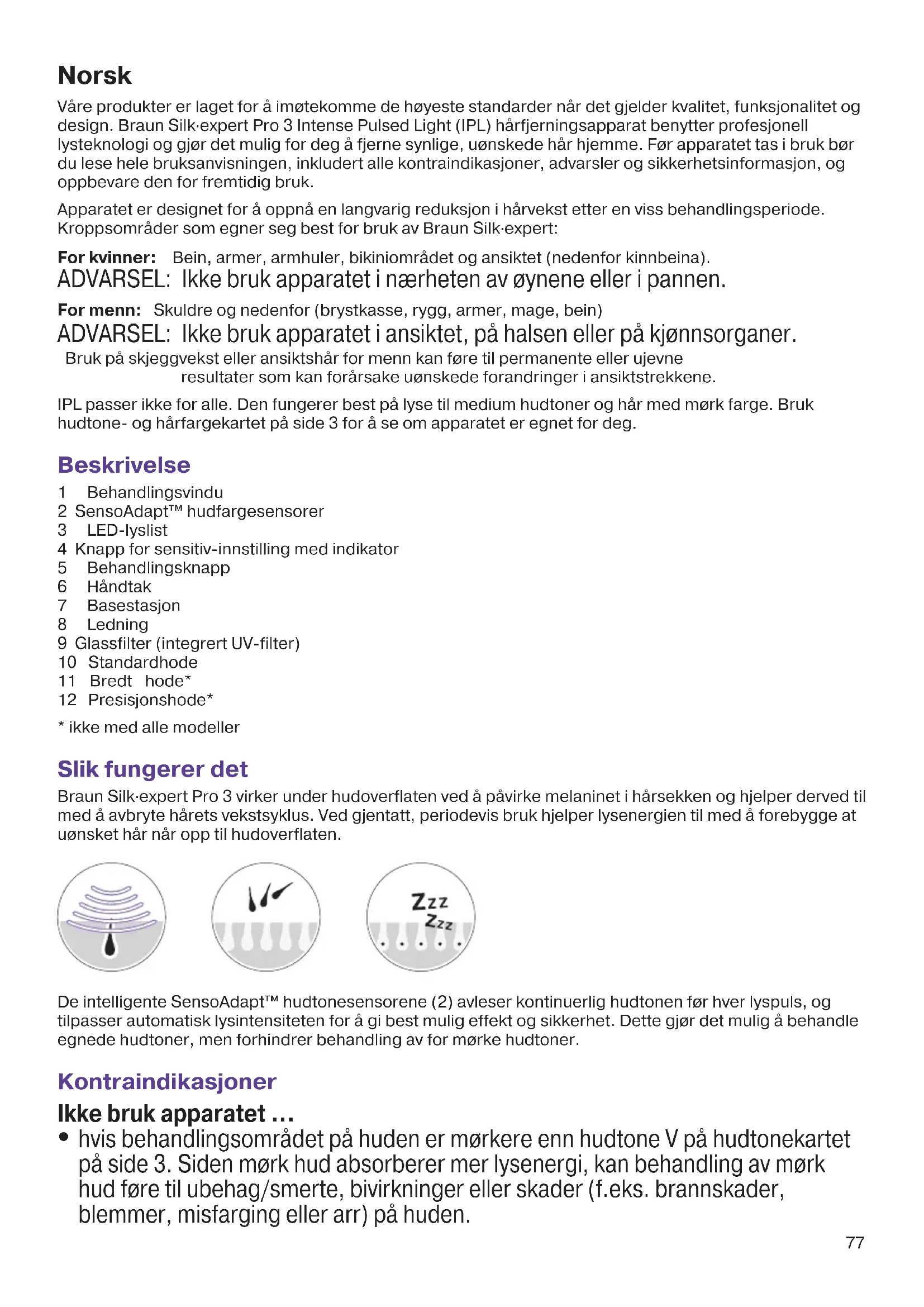 - ikke med alle modeller Slik fungerer det Braun Silk·expert Pro 3 virker under hudoverflaten ved å påvirke melaninet i hårsekken og hjelper derved til med å avbryte hårets vekstsyklus. Ved gjentatt, periodevis bruk hjelper lysenergien til med å forebygge at uønsket hår når opp til hudoverflaten. De intelligente SensoAdapt™ hudtonesensorene (2) avleser kontinuerlig hudtonen før hver lyspuls, og tilpasser automatisk lysintensiteten for å gi best mulig effekt og sikkerhet. Dette gjør det mulig å behandle egnede hudtoner, men forhindrer behandling av for mørke hudtoner. Kontraindikasjoner Ikke bruk apparatet …