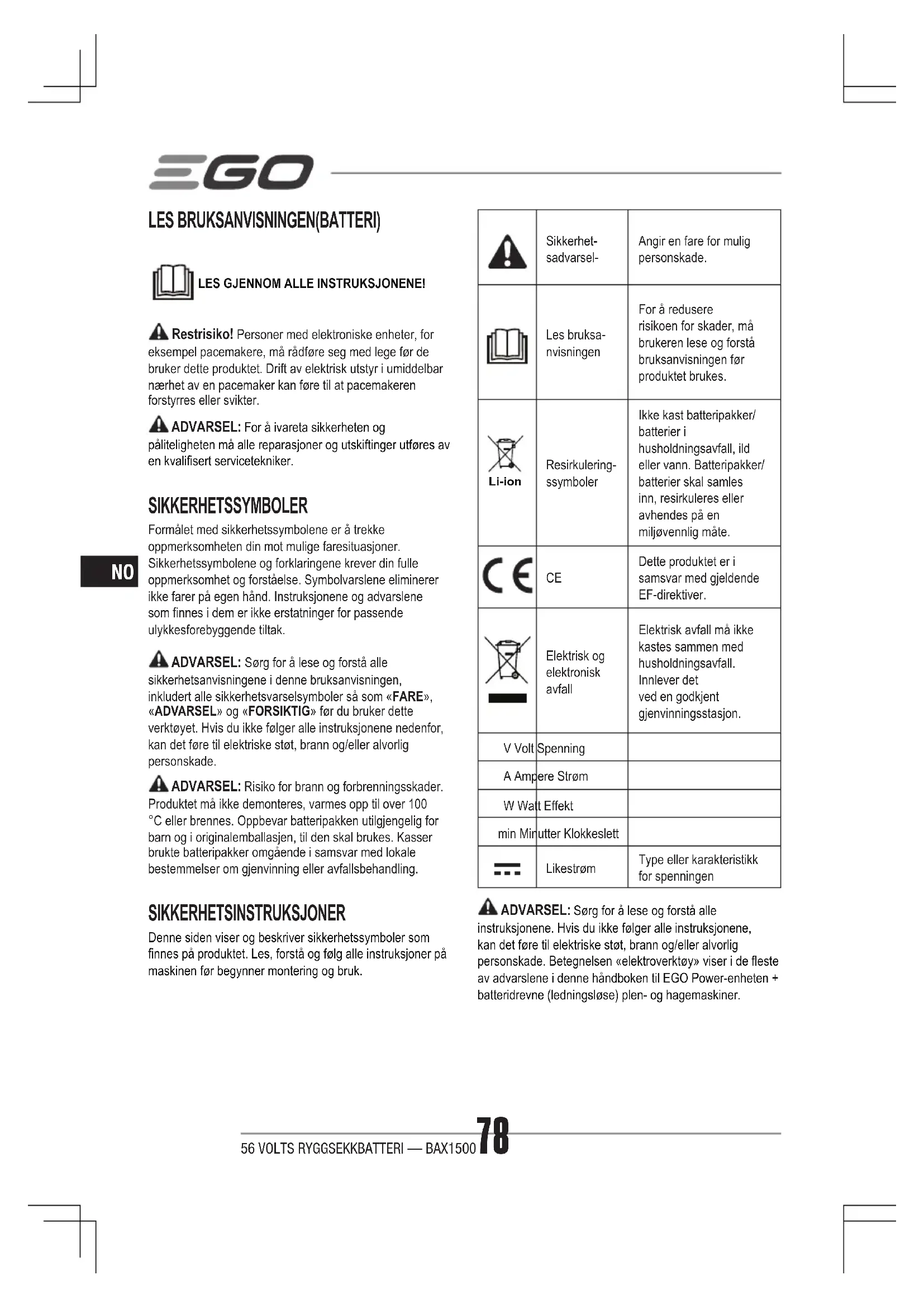 Dette produktet er i samsvar med gjeldende EF-direktiver. Elektrisk og elektronisk avfall Elektrisk avfall må ikke kastes sammen med husholdningsavfall. Innlever det ved en godkjent gjenvinningsstasjon. V Volt Spenning A Ampere Strøm W Watt Effekt min Minutter Klokkeslett Likestrøm Type eller karakteristikk for spenningen ADVARSEL: Sørg for å lese og forstå alle instruksjonene. Hvis du ikke følger alle instruksjonene, kan det føre til elektriske støt, brann og/eller alvorlig personskade. Betegnelsen «elektroverktøy» viser i de este av advarslene i denne håndboken til EGO Power-enheten + batteridrevne (ledningsløse) plen- og hagemaskiner.56 VOLTS RYGGSEKKBATTERI — BAX1500 79