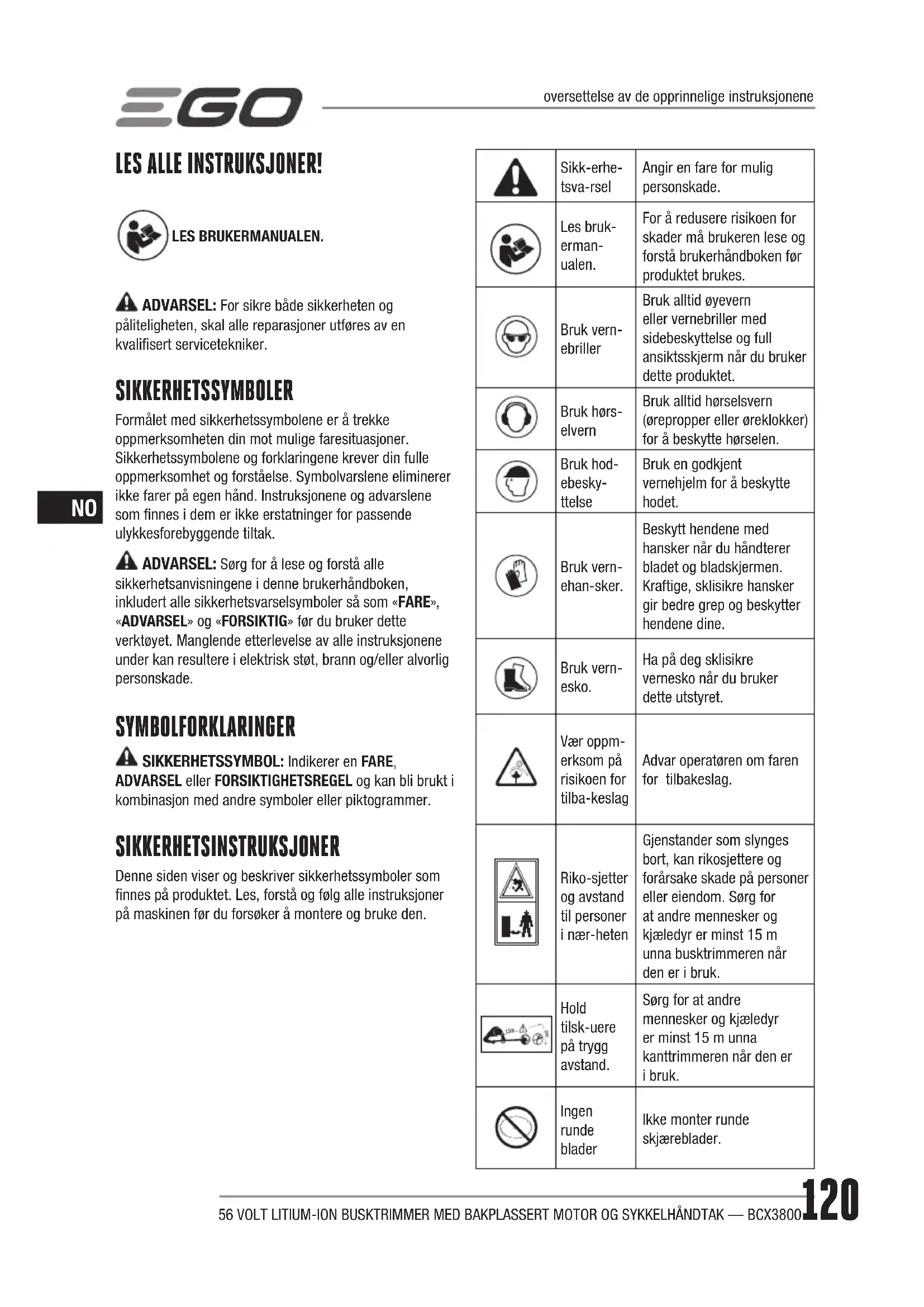 LES ALLE INSTRUKSJONER! LES BRUKERMANUALEN. ADVARSEL: For sikre både sikkerheten og påliteligheten, skal alle reparasjoner utføres av en kvalifisert servicetekniker. SIKKERHETSSYMBOLER Formålet med sikkerhetssymbolene er å trekke oppmerksomheten din mot mulige faresituasjoner. Sikkerhetssymbolene og forklaringene krever din fulle oppmerksomhet og forståelse. Symbolvarslene eliminerer ikke farer på egen hånd. Instruksjonene og advarslene som finnes i dem er ikke erstatninger for passende ulykkesforebyggende tiltak. ADVARSEL: Sørg for å lese og forstå alle sikkerhetsanvisningene i denne brukerhåndboken, inkludert alle sikkerhetsvarselsymboler så som «FARE», «ADVARSEL» og «FORSIKTIG» før du bruker dette verktøyet. Manglende etterlevelse av alle instruksjonene under kan resultere i elektrisk støt, brann og/eller alvorlig personskade. SYMBOLFORKLARINGER SIKKERHETSSYMBOL: Indikerer en FARE, ADVARSEL eller FORSIKTIGHETSREGEL og kan bli brukt i kombinasjon med andre symboler eller piktogrammer. SIKKERHETSINSTRUKSJONER Denne siden viser og beskriver sikkerhetssymboler som finnes på produktet. Les, forstå og følg alle instruksjoner på maskinen før du forsøker å montere og bruke den. Sikk-erhe- tsva-rsel Angir en fare for mulig personskade. Les bruk- erman- ualen. For å redusere risikoen for skader må brukeren lese og forstå brukerhåndboken før produktet brukes. Bruk vern- ebriller Bruk alltid øyevern eller vernebriller med sidebeskyttelse og full ansiktsskjerm når du bruker dette produktet. Bruk hørs- elvern Bruk alltid hørselsvern (ørepropper eller øreklokker) for å beskytte hørselen. Bruk hod- ebesky- ttelse Bruk en godkjent vernehjelm for å beskytte hodet. Bruk vern- ehan-sker. Beskytt hendene med hansker når du håndterer bladet og bladskjermen. Kraftige, sklisikre hansker gir bedre grep og beskytter hendene dine. Bruk vern- esko. Ha på deg sklisikre vernesko når du bruker dette utstyret. Vær oppm- erksom på risikoen for tilba-keslag Advar operatøren om faren for tilbakeslag. Riko-sjetter og avstand til personer i nær-heten Gjenstander som slynges bort, kan rikosjettere og forårsake skade på personer eller eiendom. Sørg for at andre mennesker og kjæledyr er minst 15 m unna busktrimmeren når den er i bruk. 15m Hold tilsk-uere på trygg avstand. Sørg for at andre mennesker og kjæledyr er minst 15 m unna kanttrimmeren når den er i bruk. Ingen runde blader Ikke monter runde skjæreblader. oversettelse av de opprinnelige instruksjonene56 VOLT LITIUM-ION BUSKTRIMMER MED BAKPLASSERT MOTOR OG SYKKELHÅNDTAK — BCX3800