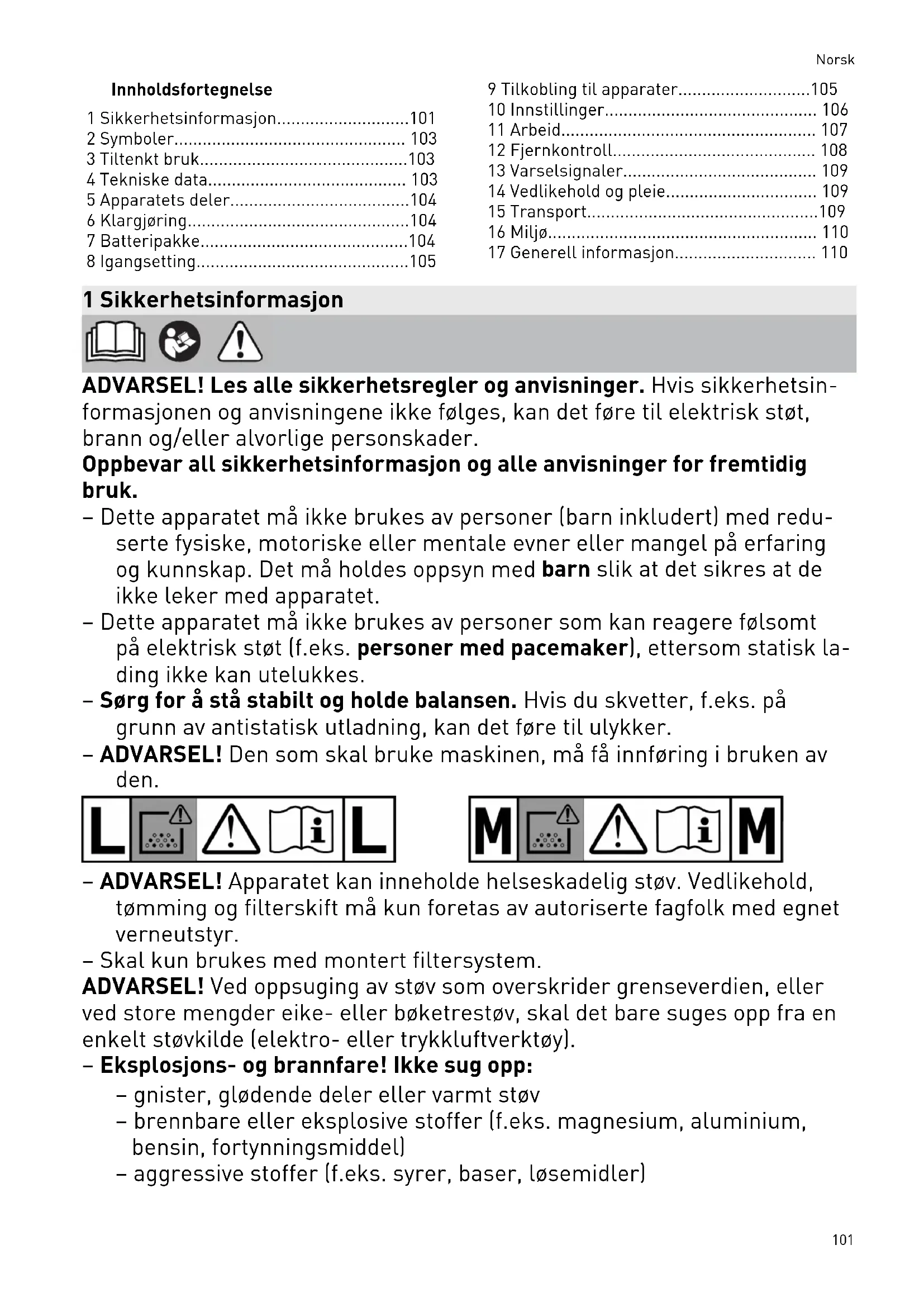 - 17 Generell informasjon 1 Sikkerhetsinformasjon ADVARSEL! Les alle sikkerhetsregler og anvisninger. Hvis sikkerhetsin formasjonen og anvisningene ikke følges, kan det føre til elektrisk støt, brann og/eller alvorlige personskader. Oppbevar all sikkerhetsinformasjon og alle anvisninger for fremtidig bruk. – Dette apparatet må ikke brukes av personer (barn inkludert) med redu serte fysiske, motoriske eller mentale evner eller mangel på erfaring og kunnskap. Det må holdes oppsyn med barn slik at det sikres at de ikke leker med apparatet. – Dette apparatet må ikke brukes av personer som kan reagere følsomt på elektrisk støt (f.eks. personer med pacemaker), ettersom statisk la ding ikke kan utelukkes. – Sørg for å stå stabilt og holde balansen. Hvis du skvetter, f.eks. på grunn av antistatisk utladning, kan det føre til ulykker. – ADVARSEL! Den som skal bruke maskinen, må få innføring i bruken av den. – ADVARSEL! Apparatet kan inneholde helseskadelig støv. Vedlikehold, tømming og filterskift må kun foretas av autoriserte fagfolk med egnet verneutstyr. – Skal kun brukes med montert filtersystem. ADVARSEL! Ved oppsuging av støv som overskrider grenseverdien, eller ved store mengder eike- eller bøketrestøv, skal det bare suges opp fra en enkelt støvkilde (elektro- eller trykkluftverktøy). – Eksplosjons- og brannfare! Ikke sug opp: – gnister, glødende deler eller varmt støv – brennbare eller eksplosive stoffer (f.eks. magnesium, aluminium, bensin, fortynningsmiddel) – aggressive stoffer (f.eks. syrer, baser, løsemidler) Norsk 101– kjemisk reaktive stoffer som fører til varmeutvikling, syrer/base, gas ser osv (f.eks. reaktive 2K-materialer, aluminium og vann) – Følg nasjonale sikkerhetsforskrifter og angivelsene fra materialprodu senten! – ADVARSEL! Slå av apparatet med én gang dersom det kommer skum eller væske ut av det. – FORSIKTIG! Rengjør innretningen for vannivåbegrensning og undersøk den jevnlig for skader. – Skal kun brukes med egnet verneutstyr. – Kontroller visuelt at apparatet er i orden, og bruk den bare i tørre omgi velser og i samsvar med instruksjonene. – Må ikke løftes eller transporteres med krankrok eller løfteverktøy! – Apparatet må kun bæres i håndtaket. – Bruk kun original sugeslange fra Festool. – Kontroller batterikontakten og filteret jevnlig for å unngå farer. Batteri kontakten må alltid byttes ut i et autorisert serviceverksted dersom den er skadet. – Ta hensyn til arbeidsomgivelsene og pass på deg selv og tredjeparter under transport eller bruk av apparatet. Da unngår du f.eks. at sugeslangen eller strømledningen fører til snu blefare. – Hold emballasjefoliene unna barn. Det er kvelningsfare. – Følg bruksanvisningen for lader og batteri. – Ikke bruk det batteridrevne apparatet med strømadaptere eller batte rier fra andre produsenter. Ikke lad batteriet med ladere fra andre produsenter. Bruker du tilbehør som ikke er godkjent av produsenten, kan dette føre til elektrisk støt og/eller alvorlige ulykker. – Når batteripakken ikke brukes, må du holde den unna metallgjen stander (f.eks. spiker, nøkler, binders o.l.) som kan kortslutte kontak tene. Kortslutning mellom batterikontaktene kan forårsake forbrennin ger eller brann. – Bruk batteripakken bare i kombinasjon med ditt Festool-verktøy. El lers vil ikke batteripakken være beskyttet mot farlig overbelastning. Bruk til andre enheter kan medføre skader og brannfare. – Ikke bruk batteripakker som er skadet eller modifisert. Skadede eller modifiserte batteripakker kan føre til brann, eksplosjon eller persons kader. – Koble batteripakken fra apparatet før du bytter tilbehørs-/forbruks deler, eller før du lagrer enheten. Slike forebyggende sikkerhetstiltak reduserer risikoen for utilsiktet oppstart av apparatet. Norsk 1022 Symboler Advarsel om generell fare Advarsel om elektrisk støt Brukerhåndbok. Les sikkerhetsanvis ningene! Brukerhåndbok, les sikkerhetsinfor masjonen! Bruk åndedrettsvern! Egnet for utskilling av støv med en eksposisjonsgrenseverdi større enn 1 mg/m p. 110