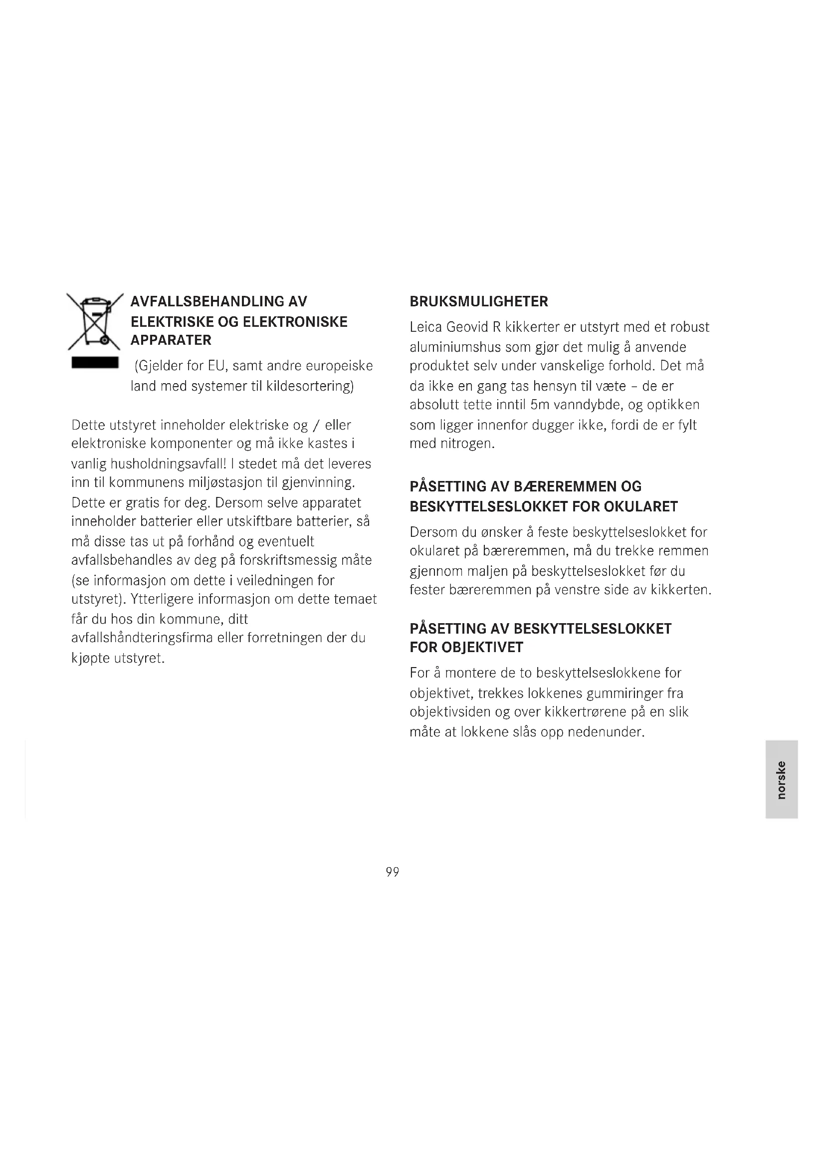APPARATER (Gjelder for EU, samt andre europeiske land med systemer til kildesortering) Dette utstyret inneholder elektriske og / eller elektroniske komponenter og må ikke kastes i vanlig husholdningsavfall! I stedet må det leveres inn til kommunens miljøstasjon til gjenvinning. Dette er gratis for deg. Dersom selve apparatet inneholder batterier eller utskiftbare batterier, så må disse tas ut på forhånd og eventuelt avfallsbehandles av deg på forskriftsmessig måte (se informasjon om dette i veiledningen for utstyret). Ytterligere informasjon om dette temaet får du hos din kommune, ditt avfallshåndteringsfirma eller forretningen der du kjøpte utstyret. BRUKSMULIGHETER Leica Geovid R kikkerter er utstyrt med et robust aluminiumshus som gjør det mulig å anvende produktet selv under vanskelige forhold. Det må da ikke en gang tas hensyn til væte – de er absolutt tette inntil 5m vanndybde, og optikken som ligger innenfor dugger ikke, fordi de er fylt med nitrogen.