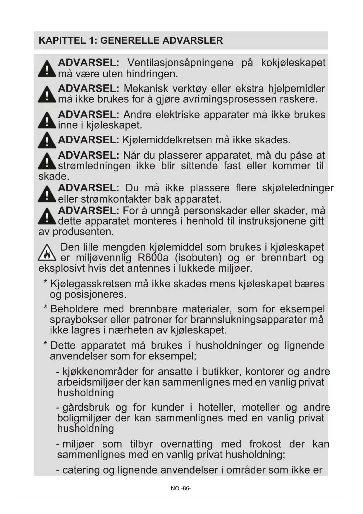 ADVARSEL: Ventilasjonsåpningene på kokjøleskapet må være uten hindringen. ADVARSEL: Mekanisk verktøy eller ekstra hjelpemidler må ikke brukes for å gjøre avrimingsprosessen raskere. ADVARSEL: Andre elektriske apparater må ikke brukes inne i kjøleskapet. ADVARSEL: Kjølemiddelkretsen må ikke skades. ADVARSEL: Når du plasserer apparatet, må du påse at strømledningen ikke blir sittende fast eller kommer til skade. ADVARSEL: Du må ikke plassere ere skjøteledninger eller strømkontakter bak apparatet. ADVARSEL: For å unngå personskader eller skader, må dette apparatet monteres i henhold til instruksjonene gitt av produsenten. Den lille mengden kjølemiddel som brukes i kjøleskapet er miljøvennlig R600a (isobuten) og er brennbart og eksplosivt hvis det antennes i lukkede miljøer.