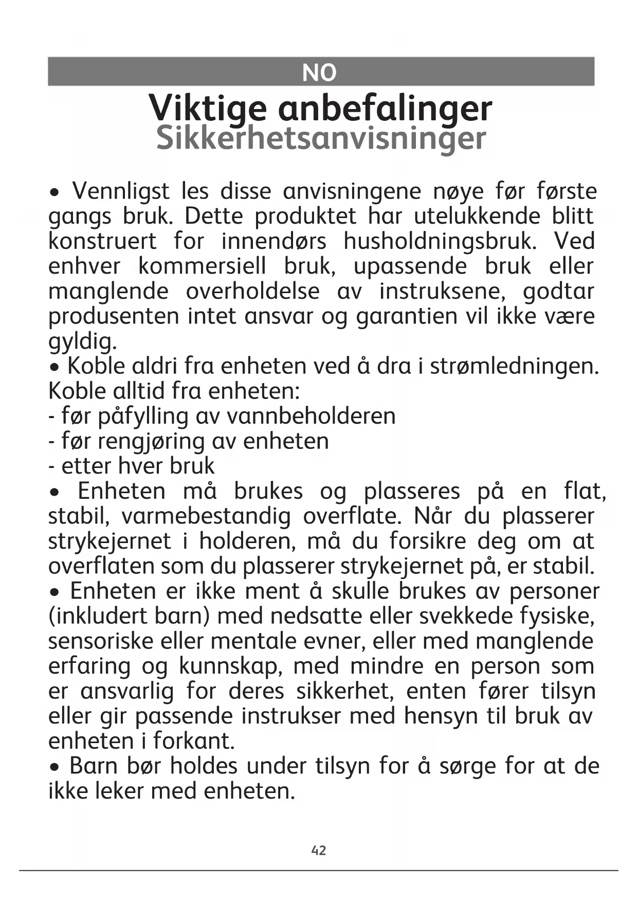 - Enheten er ikke ment å skulle brukes av personer (inkludert barn) med nedsatte eller svekkede fysiske, sensoriske eller mentale evner, eller med manglende erfaring og kunnskap, med mindre en person som er ansvarlig for deres sikkerhet, enten fører tilsyn eller gir passende instrukser med hensyn til bruk av enheten i forkant.