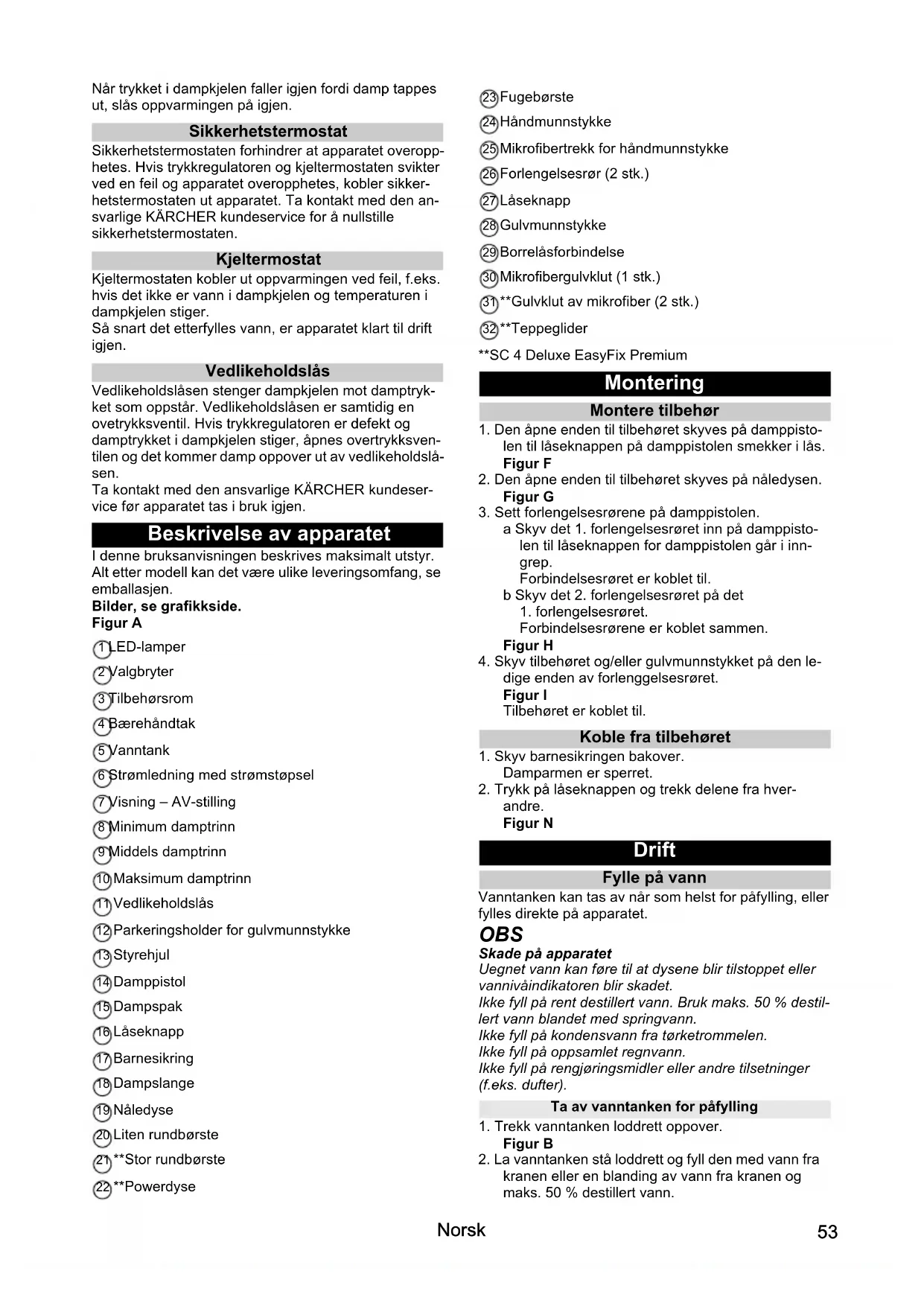 Tekniske data Der tages forbehold for tekniske ændringer. Indhold Generelle merknader Les denne oversettelsen av den origina- le driftsveiledningen før apparatet tas i bruk første gang, og følg de vedlagte sikkerhetsanvisningene. Følg anvisningene. Oppbevar begge heftene til senere bruk eller for annen eier. Forskriftsmessig bruk Dette apparatet skal kun brukes til private formål. Appa- ratet er ment for rengjøring med damp og kan brukes med egnet tilbehør, som beskrevet i denne bruksanvis- ningen. Rengjøringsmiddel er ikke nødvendig. Følg sik- kerhetsanvisningene. Miljøvern Materialet i emballasjen kan resirkuleres. Kvitt deg med emballasjen på miljøvennlig måte. Elektriske og elektroniske apparater inneholder verdifulle resirkulerbare materialer og ofte deler batterier, batteripakker eller olje. Disse kan utgjø- re en potensiell fare for helse og miljø ved feil bruk eller feil avfallsbehandling. Disse delene er imidler- tid nødvendige for korrekt drift av apparatet. Apparater merket med dette symbolet skal ikke kastes i hushold- ningsavfallet. Anvisninger om innhold (REACH) Aktuell informasjon om stoffene i innholdet finner du un- der: www.kaercher.com/REACH Tilbehør og reservedeler Bruk bare originalt tilbehør og originale reservedeler; de garanterer for en sikker og problemfri drift av apparatet. Informasjon om tilbehør og reservedeler finner du på www.kaercher.com. Leveringsomfang Apparatets leveringsomfang er vist på emballasjen. Kontroller at innholdet i pakken er komplett når du pak- ker ut. Manglende tilbehør eller transportskader skal meldes til forhandleren. Garanti Vår ansvarlige salgsorganisasjon for det enkelte land har utgitt garantibetingelsene som gjelder i det aktuelle landet. Eventuelle feil på apparatet repareres gratis i ga- rantitiden dersom disse kan føres tilbake til material- el- ler produksjonsfeil. Ved behov for garantireparasjoner, vennligst henvend deg med kjøpskvitteringen til din for- handler eller nærmeste autoriserte kundeservice. (Se adresse på baksiden) Sikkerhetsinnretninger 몇 FORSIKTIG Manglende eller endrede sikkerhetsinnretninger Sikkerhetsinnretningene tjener til din egen sikkerhet. Du må aldri forandre eller omgå sikkerhetsinnretninger. Symboler på apparatet (avhengig av apparattype) Trykkregulator Trykkregulatoren holder trykket i dampkjelen så kon- stant som mulig under drift. Når det maksimale drift- strykket i dampkjelen er nådd, slås oppvarmingen av. SC 4 De- luxe EasyFix SC 4 De- luxe EasyFix Premi-