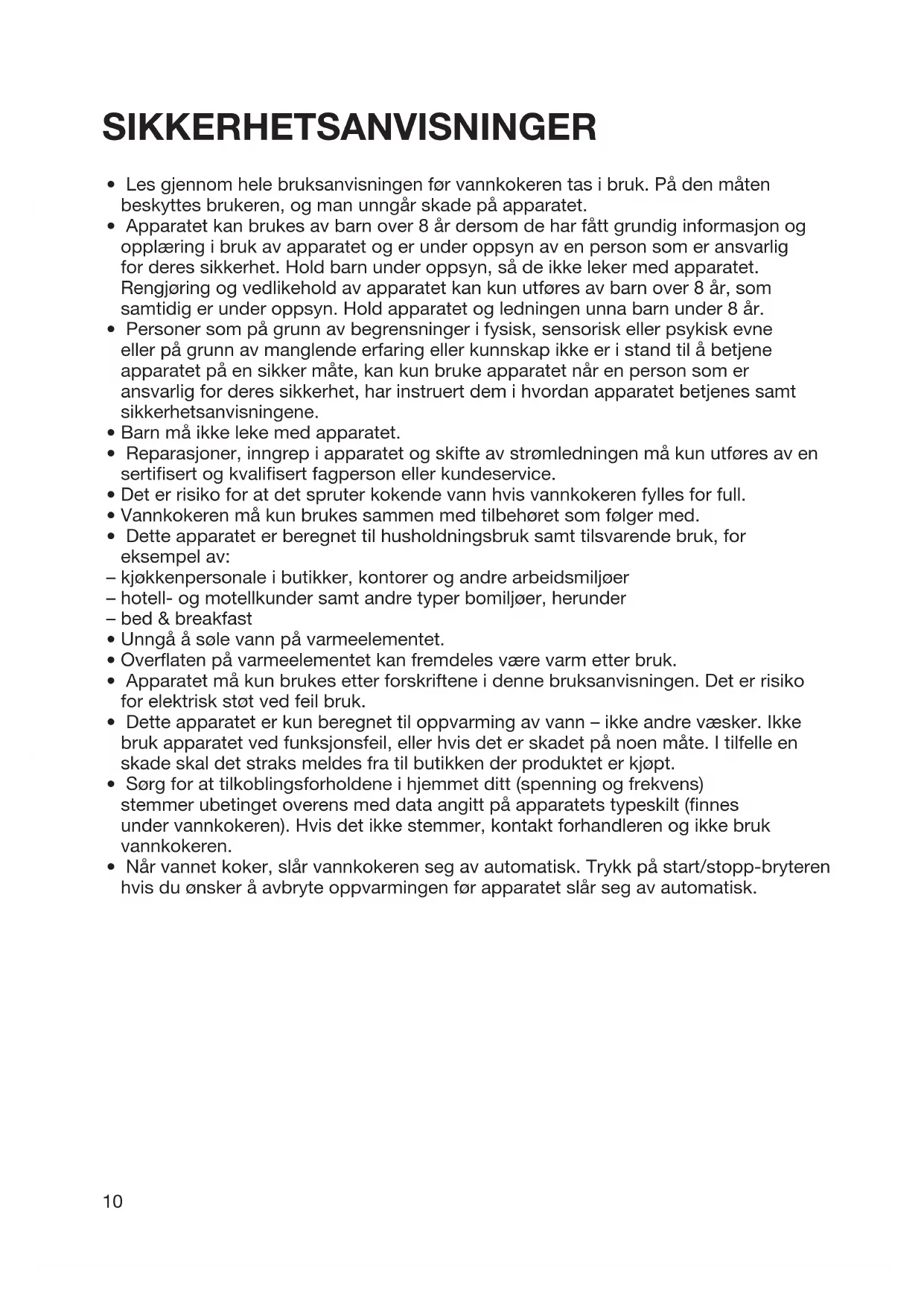 - Les gjennom hele bruksanvisningen før vannkokeren tas i bruk. På den måten beskyttes brukeren, og man unngår skade på apparatet.