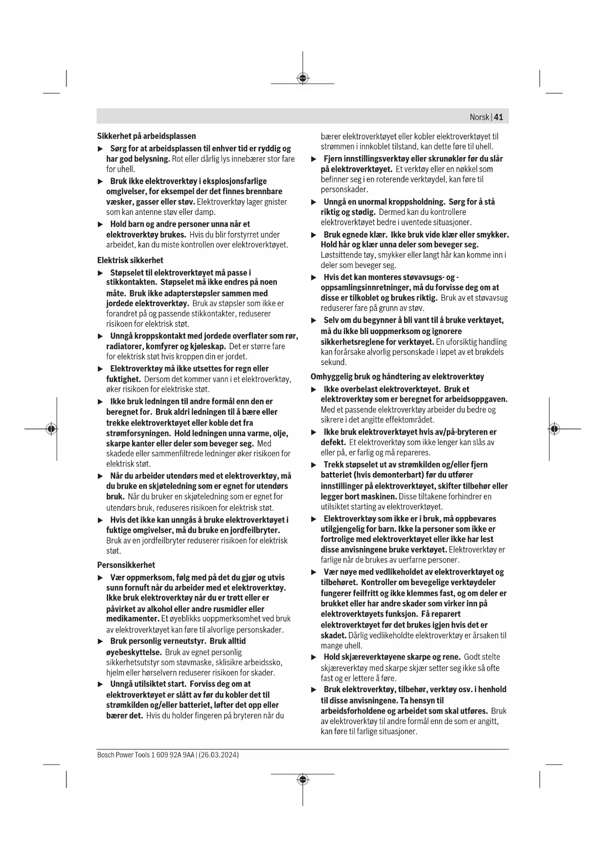 kg 3,7 Kapslingsgrad /II A) Vekt uten strømkabel og uten nettstøpsel Angivelsene gjelder for merkespenning [U] på 230 V. Ved avvikende spenning og på utførelser for bestemte land kan disse angivelsene variere. Verdiene kan variere avhengig av produktet, bruksområdet og miljøforholdene. Du finner mer informasjon på www.bosch-professional.com/wac. Støy-/vibrasjonsinformasjon Støyemisjon målt i henhold til ENIEC62841‑2‑6. Vanlig A-støynivå for elektroverktøyet: lydtrykknivå 89dB(A); lydeffektnivå 97dB(A). Usikkerhet K=3dB. Bruk hørselvern! Vibrasjon totalt a