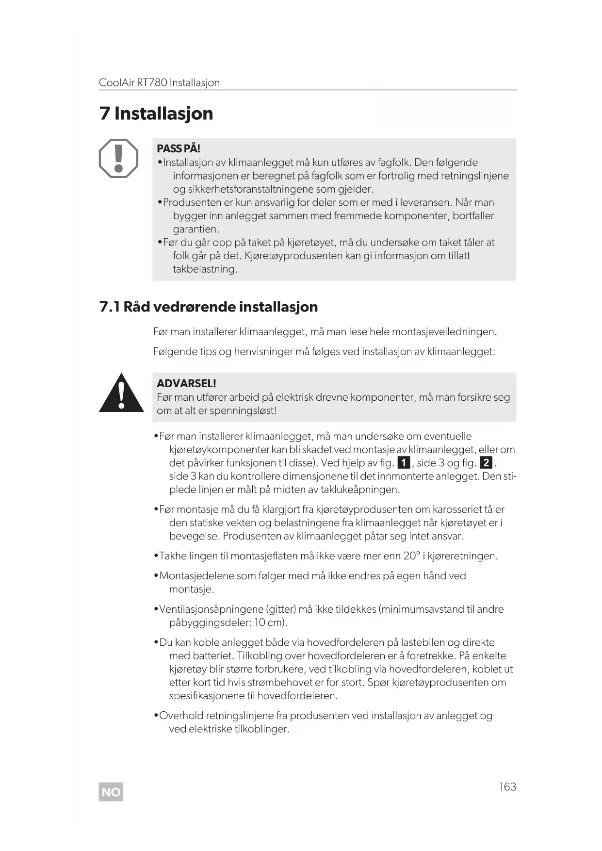 - Før du går opp på taket på kjøretøyet, må du undersøke om taket tåler at folk går på det. Kjøretøyprodusenten kan gi informasjon om tillatt takbelastning. ADVARSEL! Før man utfører arbeid på elektrisk drevne komponenter, må man forsikre seg om at alt er spenningsløst! RT780-Iveco--I-16s.book Seite 163 Donnerstag, 6. Juli 2017 3:16 15NO Installasjon CoolAir RT780