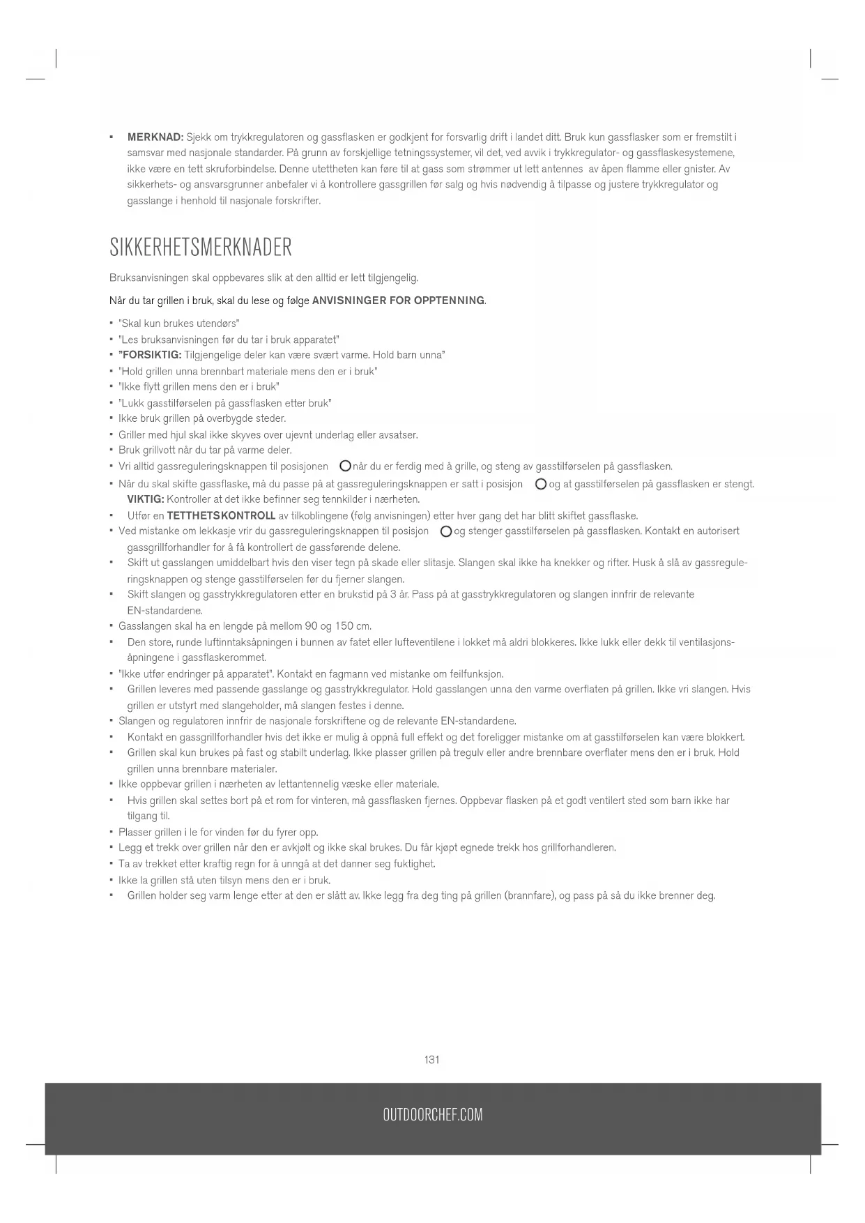 BRUKSANVISNING VIKTIG: Les denne bruksanvisningen nøye før du begynner å bruke din OUTDOORCHEF gasskulegrill. SIKKERHETSINFORMASJON Alle som skal bruke grillen må være kjent med og følge fremgangsmåten for trygg opptenning. Ikke la barn bruke grillen. Følg instruksene i monteringsanvisningen. Ikke-forskriftsmessig montering kan få farlige følger. Ikke plasser lettantennelig væske/material eller reservegassflasker i nærheten av grillen. Ikke plasser grillen eller gassflasken(e) i lukkede rom uten ventilasjon. Les bruksanvisningen nøye før du tar i bruk gasskulegrillen. Grillen skal kun brukes i friluft, og i en avstand på minst 1,5 m fra brennbare gjen- stander. GASSFLASKER