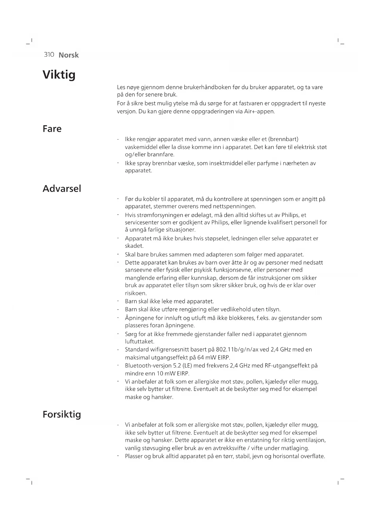 Bluetooth- versjon 5.2 (LE) med frekvens 2,4 GHz med RF-utgangseffekt pā mindre enn 10 mW EIRP. - Vi anbefaler at folk som er allergiske mot stov, pollen, kjaeledyr eller mugg,/DD,ukke selv bytter ut filtrene. Eventuelt at de beskytter seg med for eksempel maske og hansker.