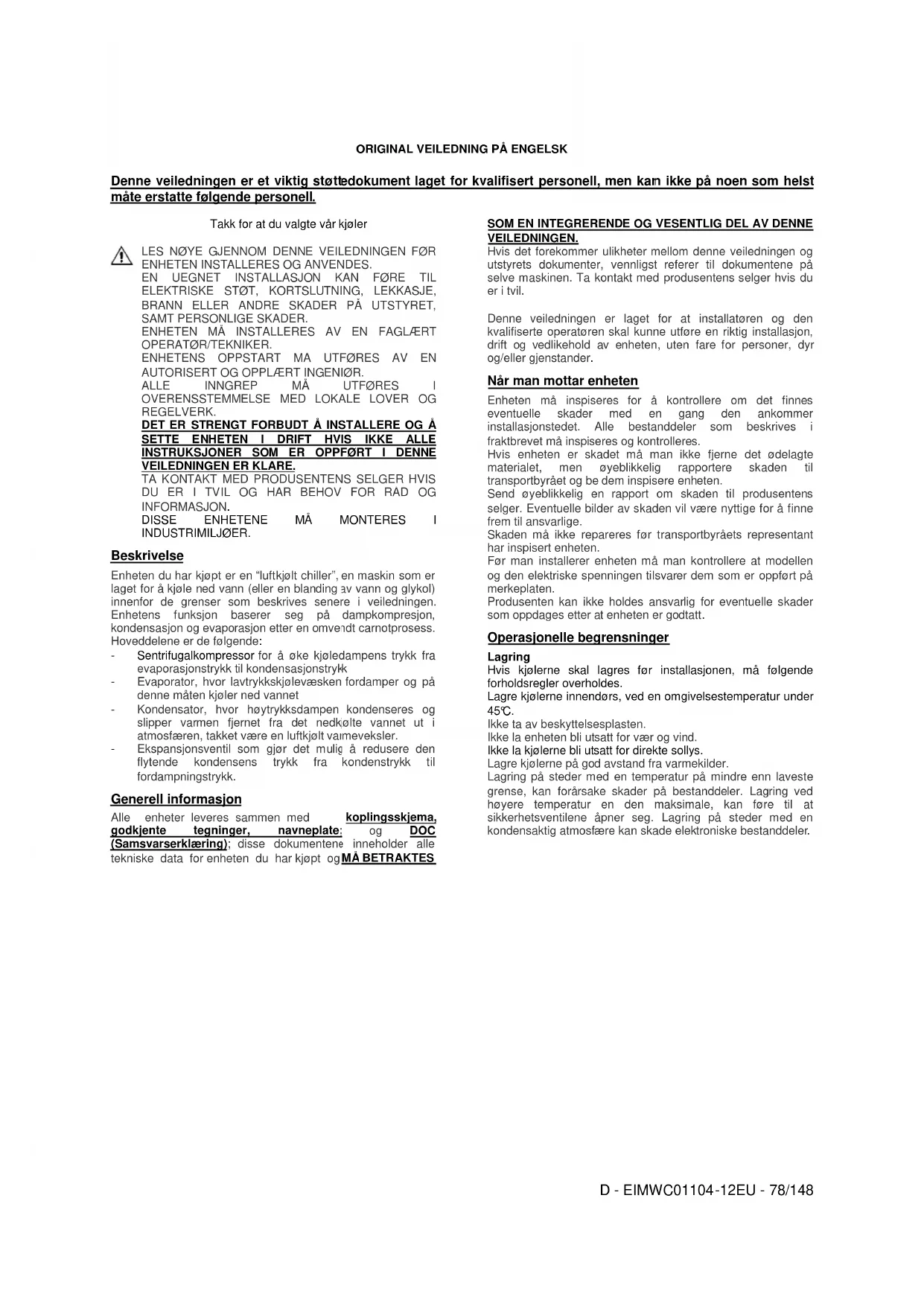 EIMWC01104 -12EU - 78/148 Denne veiledningen er et viktig støttedokument laget for kvalifisert personell, men kan ikke på noen som helst SOM EN INTEGRERENDE OG VESENTLIG DEL AV DENNE Hvis det forekommer ulikheter mellom denne veiledningen og utstyrets dokumenter, vennligst referer ti l dokumentene på selve maskinen. Ta kontakt med produsentens selger hvis du Denne veiledningen er laget for at installatøren og den kvalifiserte operatøren skal kunne utføre en riktig installasjon, drift og vedlikehold av enheten, uten fare for personer, dyr Enheten må inspiseres for å kontrollere om det finnes eventuelle skader med en gang den ankommer installasjonstedet. Alle bestanddeler som beskrives i fraktbrevet må inspiseres og kontrolleres.