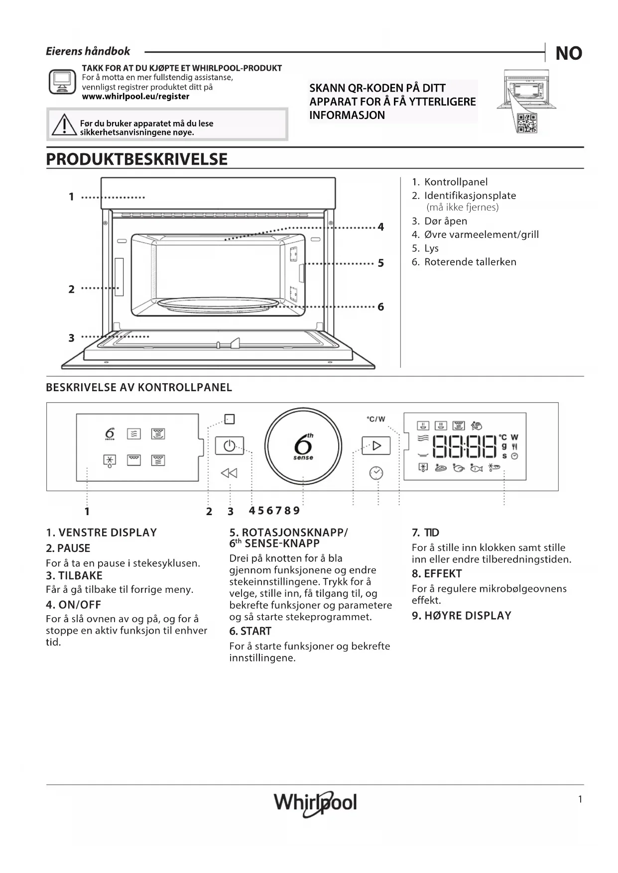 TAKK FOR AT DU KJØPTE ET WHIRLPOOL-PRODUKT For å motta en mer fullstendig assistanse, vennligst registrer produktet ditt på www . whirlpool. eu/ register Før du bruker apparatet må du lese sikkerhetsanvisningene nøye.