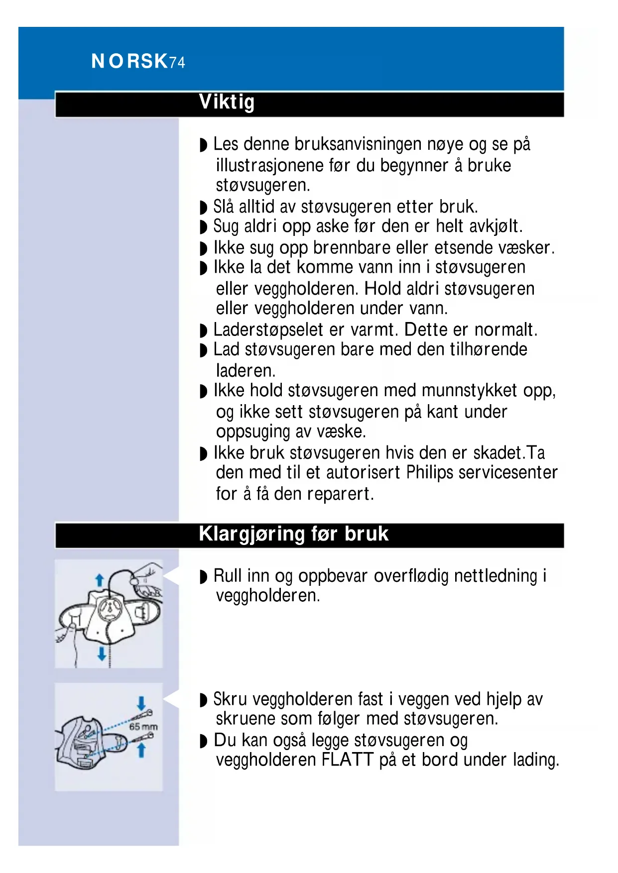- Ikke bruk støvsugeren hvis den er skadet. Ta den med til et autorisert Philips servicesenter for Å få den reparert.