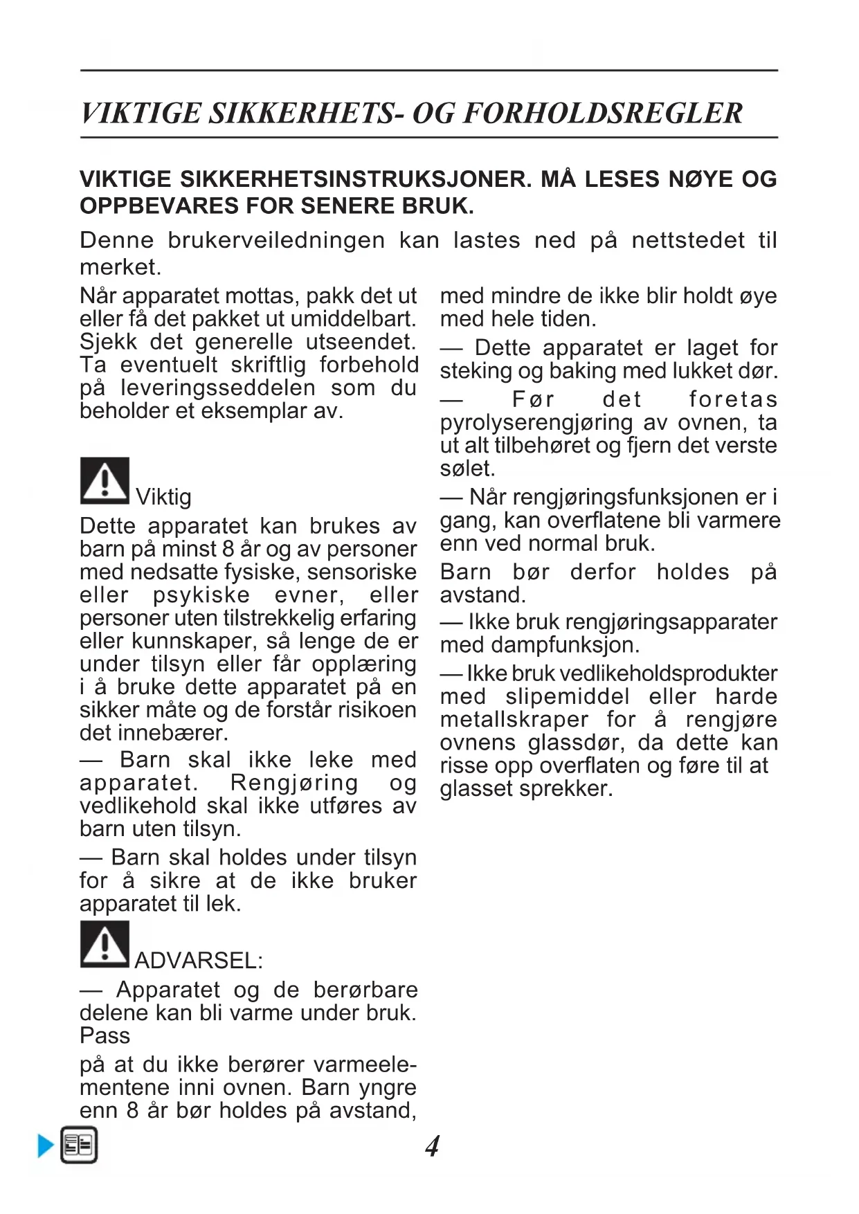 Når apparatet mottas, pakk det ut eller få det pakket ut umiddelbart. Sjekk det generelle utseendet. Ta eventuelt skriftlig forbehold på leveringsseddelen som du beholder et eksemplar av. Viktig Dette apparatet kan brukes av barn på minst 8 år og av personer med nedsatte fysiske, sensoriske eller psykiske evner, eller personer uten tilstrekkelig erfaring eller kunnskaper, så lenge de er under tilsyn eller får opplæring i å bruke dette apparatet på en sikker måte og de forstår risikoen det innebærer. — Barn skal ikke leke med apparatet. Rengjøring og vedlikehold skal ikke utføres av barn uten tilsyn. — Barn skal holdes under tilsyn for å sikre at de ikke bruker apparatet til lek. ADVARSEL: — Apparatet og de berørbare delene kan bli varme under bruk. Pass på at du ikke berører varmeele- mentene inni ovnen. Barn yngre enn 8 år bør holdes på avstand, med mindre de ikke blir holdt øye med hele tiden. — Dette apparatet er laget for steking og baking med lukket dør. — Før det foretas pyrolyserengjøring av ovnen, ta ut alt tilbehøret og fjern det verste sølet. — Når rengjøringsfunksjonen er i gang, kan overatene bli varmere enn ved normal bruk. Barn bør derfor holdes på avstand. — Ikke bruk rengjøringsapparater med dampfunksjon. — Ikke bruk vedlikeholdsprodukter med slipemiddel eller harde metallskraper for å rengjøre ovnens glassdør, da dette kan risse opp overaten og føre til at glasset sprekker. VIKTIGE SIKKERHETSINSTRUKSJONER. MÅ LESES NØYE OG OPPBEVARES FOR SENERE BRUK. Denne brukerveiledningen kan lastes ned på nettstedet til merket.5