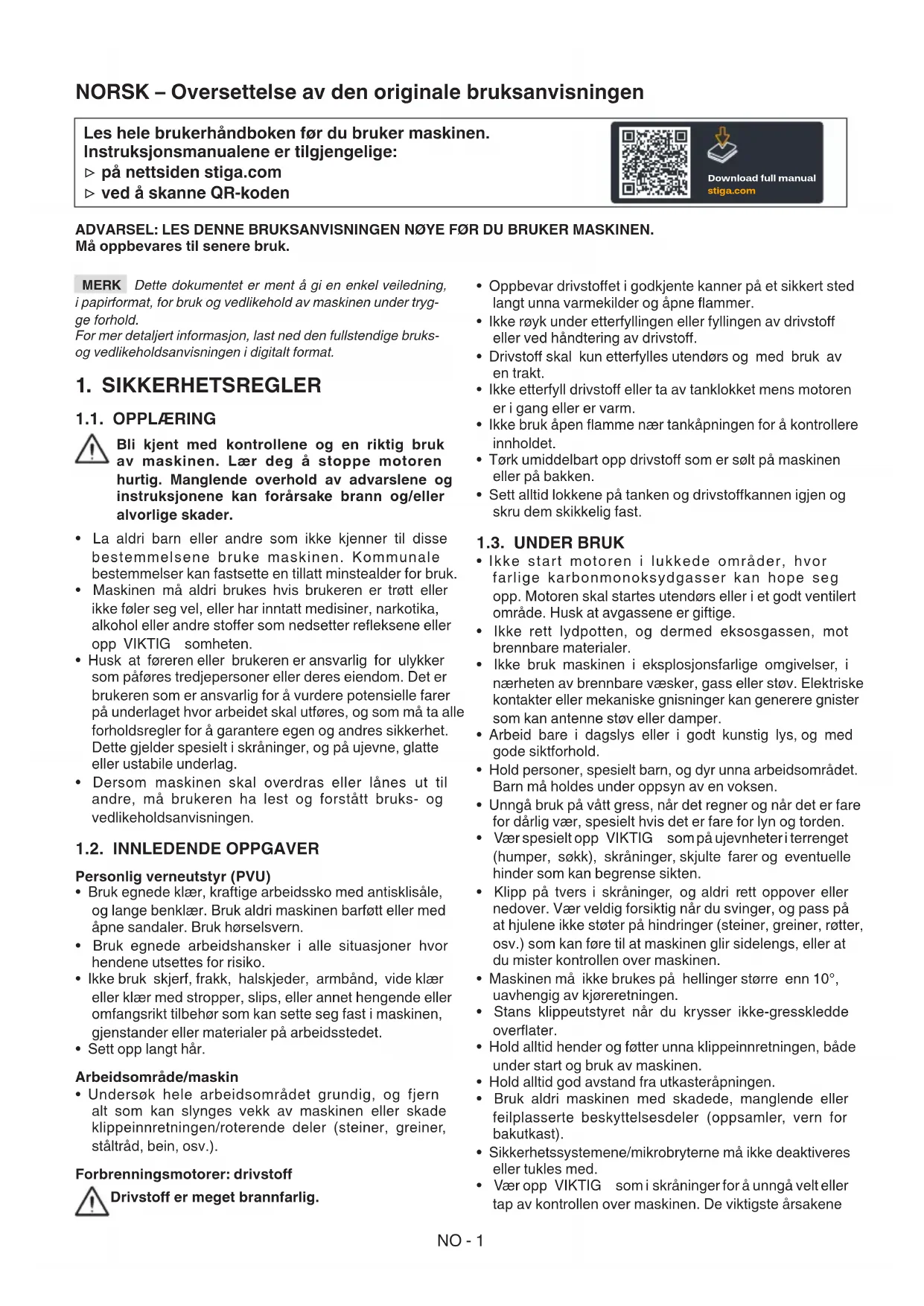 1.1. OPPLÆRING Bli kjent med kontrollene og en riktig bruk av maskinen. Lær deg å stoppe motoren hurtig. Manglende overhold av advarslene og instruksjonene kan forårsake brann og/eller alvorlige skader.