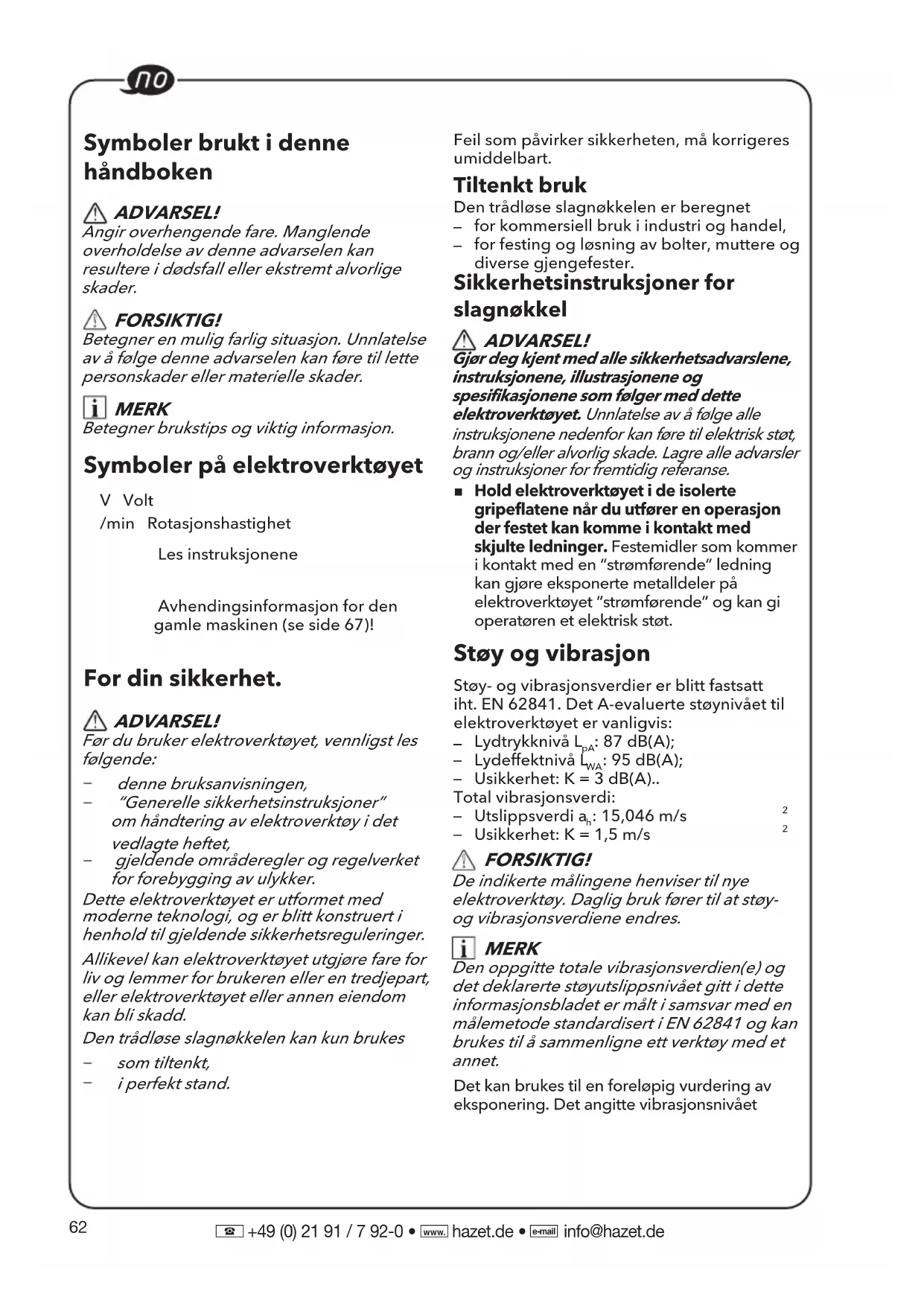 +49 (0) 21 91 / 7 92-0 • hazet.de • info@hazet.de Symboler brukt i denne håndboken ADVARSEL! Angir overhengende fare. Manglende overholdelse av denne advarselen kan resultere i dødsfall eller ekstremt alvorlige skader. FORSIKTIG! Betegner en mulig farlig situasjon. Unnlatelse av å følge denne advarselen kan føre til lette personskader eller materielle skader. MERK Betegner brukstips og viktig informasjon. Symboler på elektroverktøyet V Volt/min Rotasjonshastighet Les instruksjonene Avhendingsinformasjon for den gamle maskinen (se side 67)! For din sikkerhet. ADVARSEL! Før du bruker elektroverktøyet, vennligst les følgende: denne bruksanvisningen, “Generelle sikkerhetsinstruksjoner” om håndtering av elektroverktøy i det vedlagte heftet, gjeldende områderegler og regelverket for forebygging av ulykker. Dette elektroverktøyet er utformet med moderne teknologi, og er blitt konstruert i henhold til gjeldende sikkerhetsreguleringer. Allikevel kan elektroverktøyet utgjøre fare for liv og lemmer for brukeren eller en tredjepart, eller elektroverktøyet eller annen eiendom kan bli skadd. Den trådløse slagnøkkelen kan kun brukes som tiltenkt, i perfekt stand. Feil som påvirker sikkerheten, må korrigeres umiddelbart. Tiltenkt bruk Den trådløse slagnøkkelen er beregnet for kommersiell bruk i industri og handel, for festing og løsning av bolter, muttere ogdiverse gjengefester. Sikkerhetsinstruksjoner for slagnøkkel ADVARSEL! Gjør deg kjent med alle sikkerhetsadvarslene, instruksjonene, illustrasjonene og spesifikasjonene som følger med dette elektroverktøyet. Unnlatelse av å følge alle instruksjonene nedenfor kan føre til elektrisk støt, brann og/eller alvorlig skade. Lagre alle advarsler og instruksjoner for fremtidig referanse.