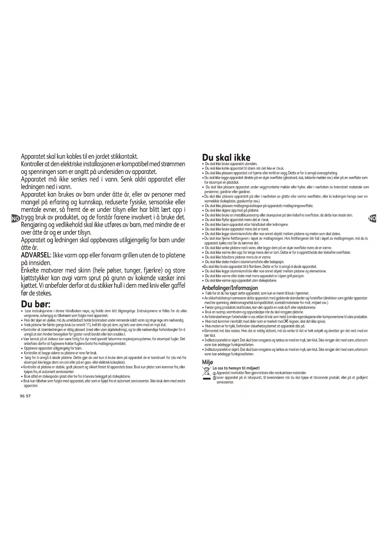 Apparatet skal kun kobles til en jordet stikkontakt. Kontroller at den elektriske installasjonen er kompatibel med strømmen og spenningen som er angitt på undersiden av apparatet. Apparatet må ikke senkes ned i vann. Senk aldri apparatet eller ledningen ned i vann. Apparatet kan brukes av barn under åtte år, eller av personer med mangel på erfaring og kunnskap, reduserte fysiske, sensoriske eller mentale evner, så fremt de er under tilsyn eller har blitt lært opp i trygg bruk av produktet, og de forstår farene involvert i å bruke det. Rengjøring og vedlikehold skal ikke utføres av barn, med mindre de er over åtte år og er under tilsyn. Apparatet og ledningen skal oppbevares utilgjengelig for barn under åtte år. ADVARSEL: Ikke varm opp eller forvarm grillen uten de to platene på innsiden. Enkelte matvarer med skinn (hele pølser, tunger, fjærkre) og store kjøttstykker kan avgi varm sprut på grunn av kokende væsker inni kjøttet. Vi anbefaler derfor at du stikker hull i dem med kniv eller gaffel før de stekes. Du bør: