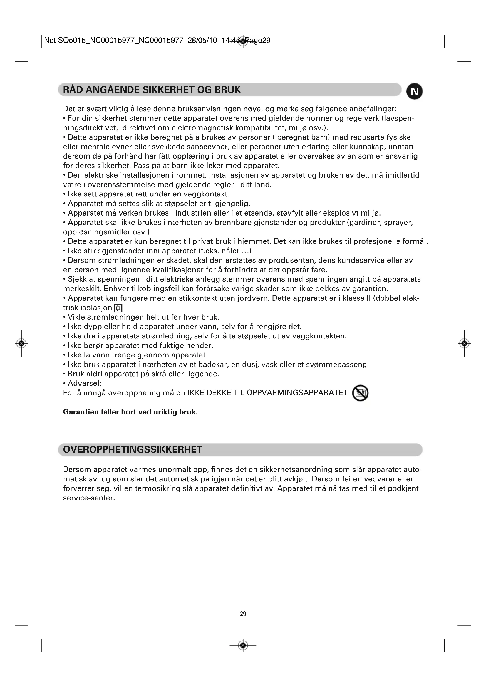 Not SO5015_NC00015977_NC00015977 28/05/10 14:46 Page28RÅD ANGÅENDE SIKKERHET OG BRUK Det er svært viktig å lese denne bruksanvisningen nøye, og merke seg følgende anbefalinger: