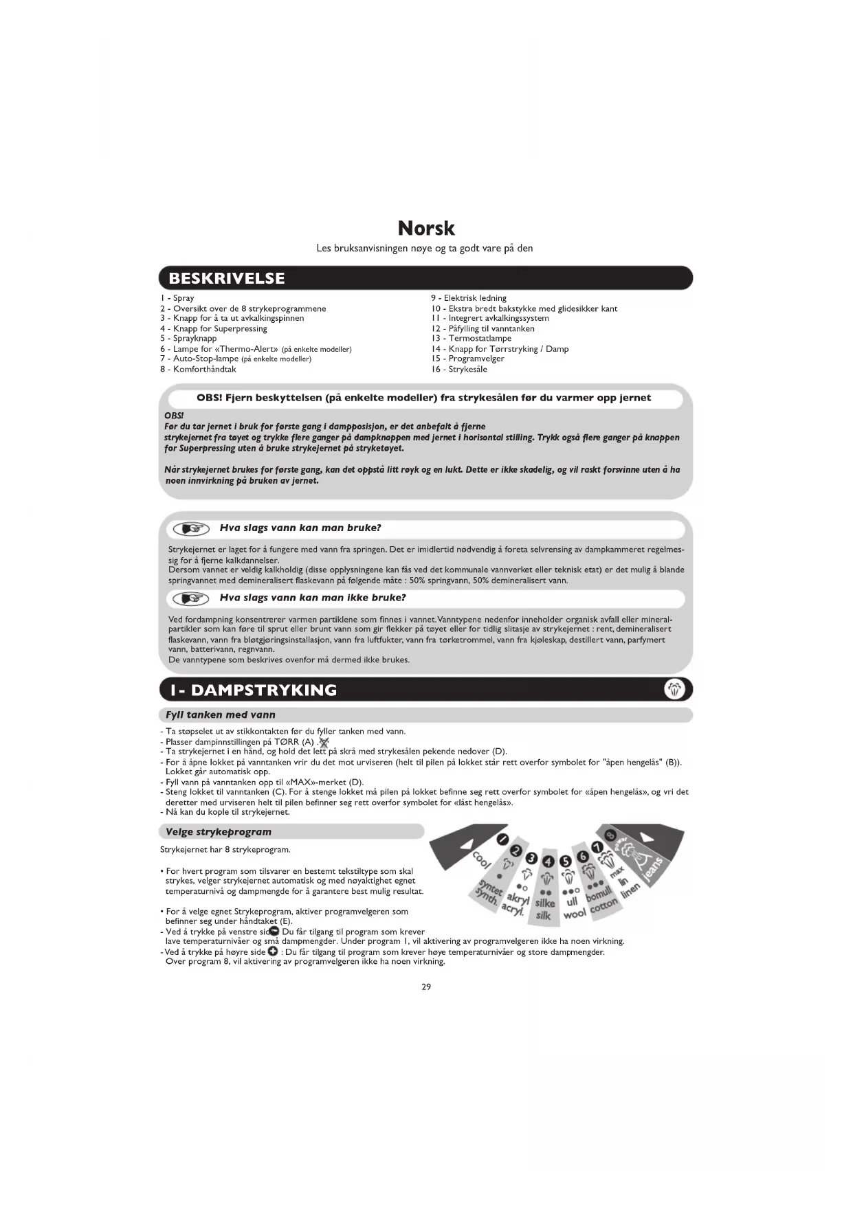 - Ta støpselet ut av stikkontakten før du fyller tanken med vann.- Plasser dampinnstillingen på TØRR (A) .- Ta strykejernet i en hånd, og hold det lett på skrå med strykesålen pekende nedover (D). - For å åpne lokket på vanntanken vrir du det mot urviseren (helt til pilen på lokket står rett overfor symbolet for "åpen hengelås" (B)). Lokket går automatisk opp.- Fyll vann på vanntanken opp til «MAX»-merket (D). - Steng lokket til vanntanken (C). For å stenge lokket må pilen på lokket befinne seg rett overfor symbolet for «åpen hengelås», og vri det deretter med urviseren helt til pilen befinner seg rett overfor symbolet for «låst hengelås».- Nå kan du kople til strykejernet. Fyll tanken med vann Velge strykeprogram Strykejernet har 8 strykeprogram.• For hvert program som tilsvarer en bestemt tekstiltype som skalstrykes, velger strykejernet automatisk og med nøyaktighet egnettemperaturnivå og dampmengde for å garantere best mulig resultat.• For å velge egnet Strykeprogram, aktiver programvelgeren sombefinner seg under håndtaket (E).- Ved å trykke på venstre side : Du får tilgang til program som kreverlave temperaturnivåer og små dampmengder. Under program 1, vil aktivering av programvelgeren ikke ha noen virkning. - Ved å trykke på høyre side : Du får tilgang til program som krever høye temperaturnivåer og store dampmengder. Over program 8, vil aktivering av programvelgeren ikke ha noen virkning. Norsk Les bruksanvisningen nøye og ta godt vare på den Hva slags vann kan man bruke? Strykejernet er laget for å fungere med vann fra springen. Det er imidlertid nødvendig å foreta selvrensing av dampkammeret regelmes- sig for å fjerne kalkdannelser. Dersom vannet er veldig kalkholdig (disse opplysningene kan fås ved det kommunale vannverket eller teknisk etat) er det mulig å blande springvannet med demineralisert flaskevann på følgende måte : 50% springvann, 50% demineralisert vann. Hva slags vann kan man ikke bruke? Ved fordampning konsentrerer varmen partiklene som finnes i vannet.Vanntypene nedenfor inneholder organisk avfall eller mineral- partikler som kan føre til sprut eller brunt vann som gir flekker på tøyet eller for tidlig slitasje av strykejernet : rent, demineralisert flaskevann, vann fra bløtgjøringsinstallasjon, vann fra luftfukter, vann fra tørketrommel, vann fra kjøleskap, destillert vann, parfymert vann, batterivann, regnvann.De vanntypene som beskrives ovenfor må dermed ikke brukes. OBS! Før du tar jernet i bruk for første gang i dampposisjon, er det anbefalt å fjerne strykejernet fra tøyet og trykke flere ganger på dampknappen med jernet i horisontal stilling. Trykk også flere ganger på knappen for Superpressing uten å bruke strykejernet på stryketøyet. Når strykejernet brukes for første gang, kan det oppstå litt røyk og en lukt. Dette er ikke skadelig, og vil raskt forsvinne uten å ha noen innvirkning på bruken av jernet. OBS! Fjern beskyttelsen (på enkelte modeller) fra strykesålen før du varmer opp jernet BESKRIVELSE 1 - Spray2 - Oversikt over de 8 strykeprogrammene3 - Knapp for å ta ut avkalkingspinnen4 - Knapp for Superpressing5 - Sprayknapp6 - Lampe for «Thermo-Alert» (på enkelte modeller)7 - Auto-Stop-lampe (på enkelte modeller)8 - Komforthåndtak9 - Elektrisk ledning10 - Ekstra bredt bakstykke med glidesikker kant11 - Integrert avkalkingssystem 12 - Påfylling til vanntanken13 - Termostatlampe14 - Knapp for Tørrstryking / Damp15 - Programvelger16 - Strykesåle30