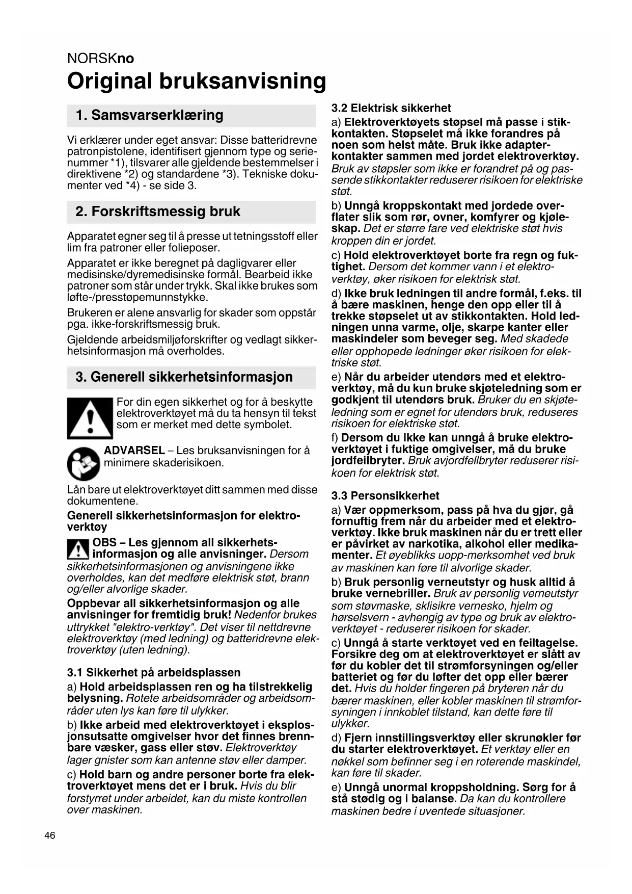 Original bruksanvisning Vi erklærer under eget ansvar: Disse batteridrevne patronpistolene, identifisert gjennom type og serie- nummer *1), tilsvarer alle gjeldende bestemmelser i direktivene *2) og standardene *3). Tekniske doku- menter ved *4) - se side 3. Apparatet egner seg til å presse ut tetningsstoff eller lim fra patroner eller folieposer. Apparatet er ikke beregnet på dagligvarer eller medisinske/dyremedisinske formål. Bearbeid ikke patroner som står under trykk. Skal ikke brukes som løfte-/presstøpemunnstykke. Brukeren er alene ansvarlig for skader som oppstår pga. ikke-forskriftsmessig bruk. Gjeldende arbeidsmiljøforskrifter og vedlagt sikker- hetsinformasjon må overholdes. For din egen sikkerhet og for å beskytte elektroverktøyet må du ta hensyn til tekst som er merket med dette symbolet. ADVARSEL – Les bruksanvisningen for å minimere skaderisikoen. Lån bare ut elektroverktøyet ditt sammen med disse dokumentene. Generell sikkerhetsinformasjon for elektro- verktøy OBS – Les gjennom all sikkerhets- informasjon og alle anvisninger. Dersom sikkerhetsinformasjonen og anvisningene ikke overholdes, kan det medføre elektrisk støt, brann og/eller alvorlige skader. Oppbevar all sikkerhetsinformasjon og alle anvisninger for fremtidig bruk! Nedenfor brukes uttrykket "elektro-verktøy". Det viser til nettdrevne elektroverktøy (med ledning) og batteridrevne elek- troverktøy (uten ledning).