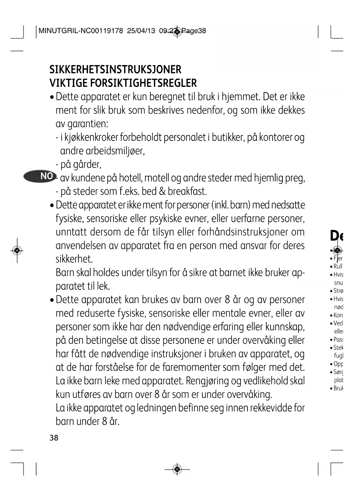 - Dette apparatet er ikke ment for personer (inkl. barn) med nedsatte fysiske, sensoriske eller psykiske evner, eller uerfarne personer, unntatt dersom de får tilsyn eller forhåndsinstruksjoner om anvendelsen av apparatet fra en person med ansvar for deres sikkerhet. Barn skal holdes under tilsyn for å sikre at barnet ikke bruker ap- paratet til lek.